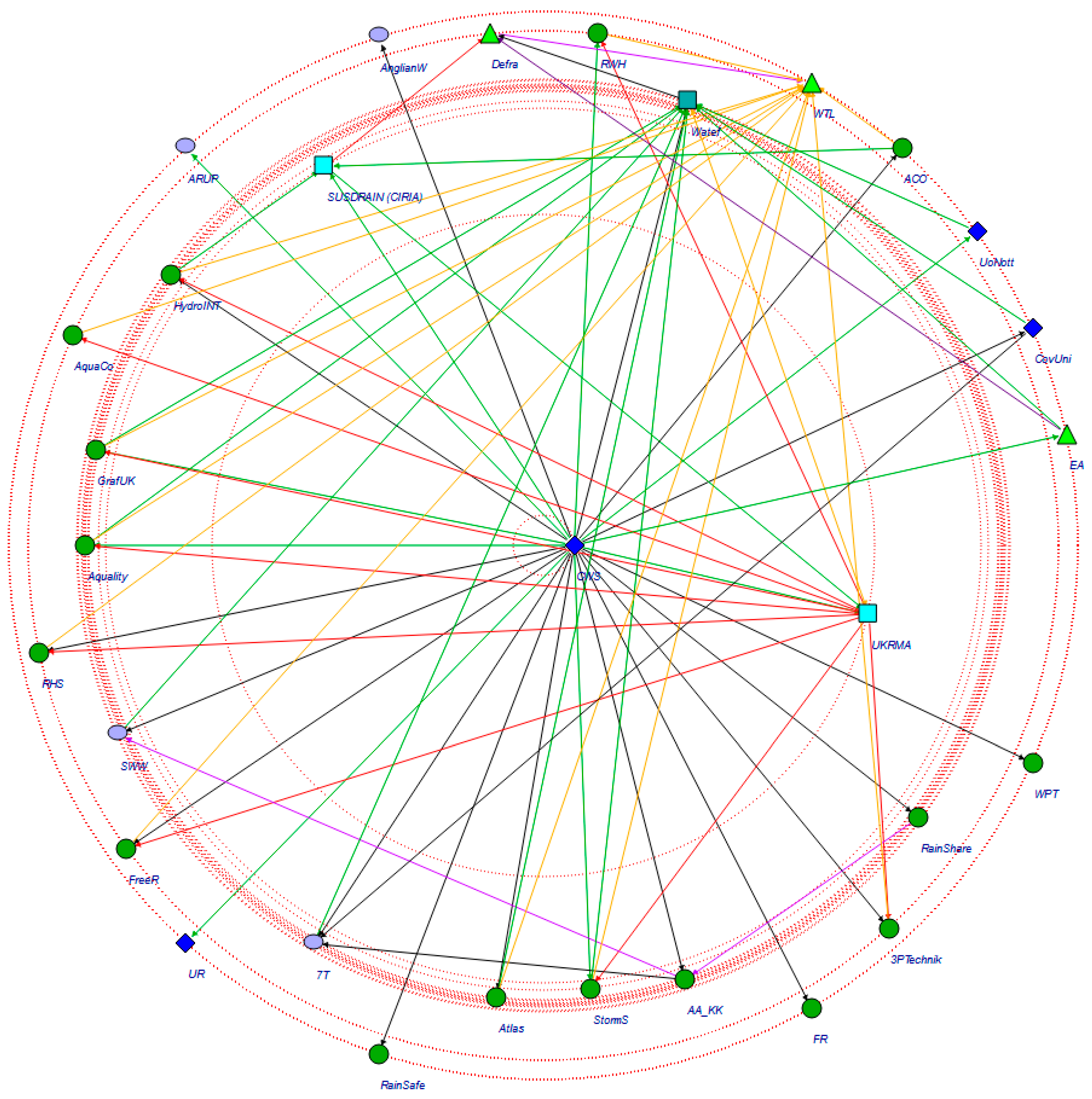 In the pilot study presented here, the lead author created an autobiographical sketch that triangulated roles and activities of relevance to RWH, including research undertaken (questionnaires and interviews with RWH users and manufacturers, system testing), contacts made within the sector, membership of relevant organisations/networks (for example the UK Rainwater Management Association), professional interactions (RWH conferences, seminars, meetings and events) and publications completed (academic and grey). Readers are referred to Ward et al. [53] and Melville-Shreeve et al. [54] for a more detailed insight into the type of research, contacts and organisations engaged. However, it should be noted that whilst a range of organisations are referred to in these previous papers, they do not comprehensively address all of the organisations included in the present paper. This does not mean the organisations that are not included have received unequal treatment, rather that other observations and implicit knowledge generated from other interactions has been drawn upon to represent their position. Reflection on these experiences and interactions enabled the relationships between different RWH innovators operating in the niche and other individuals and groups undertaking activity on RWH to be identified. Mapping these relationships on paper snowballed the identification of other organisations and the representation of the social network expanded. Once the lead author had finished developing the representation of the RWH network, two colleagues with equal knowledge of and engagement with the RWH niche and water management sector thoroughly reviewed it to verify the information represented (to achieve a basic level of inter-rater reliability), by systematically checking each organisation and relationship included and commenting on any required revisions.