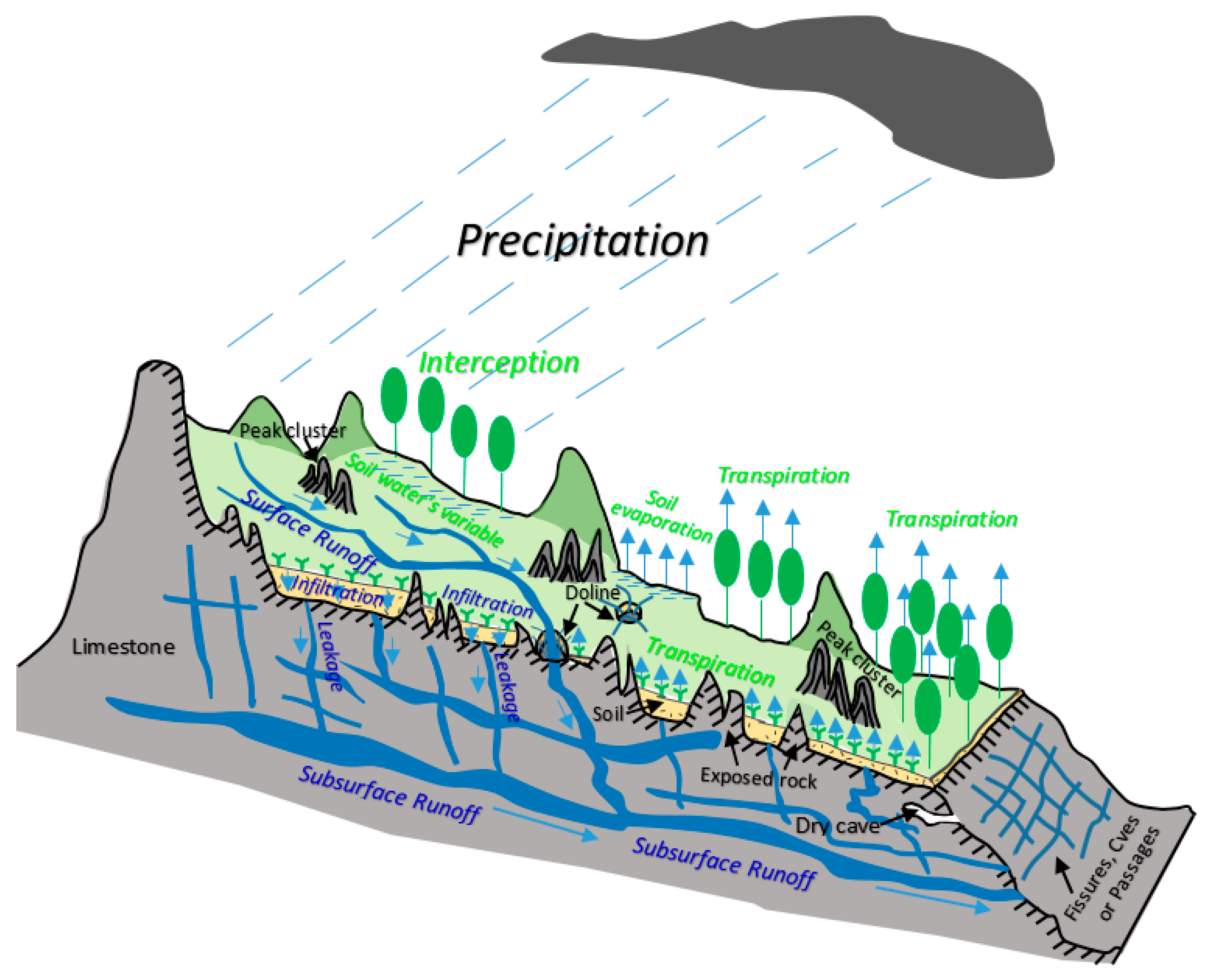 - Wen, Z.; Yang, S.; Song, W.; Bai, X.; Gao, F.; Liu, W. The numerical simulation on green water cycle of typical vegetation types in karst area. Geogr. Res. 2010, 29, 1841–1852. (In Chinese) [Google Scholar]