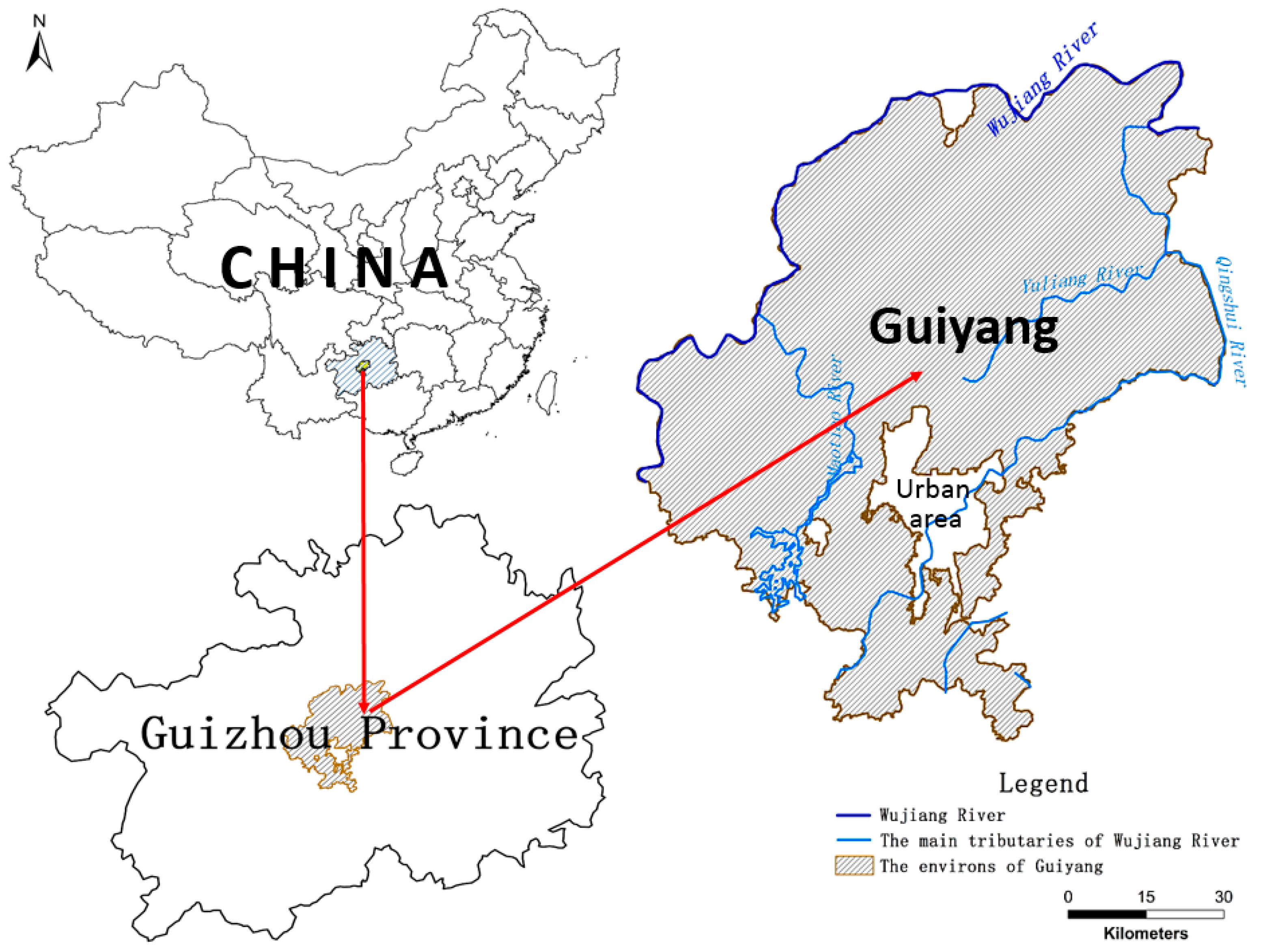 Guiyang as the provincial capital of Guizhou province, is located at 26°11′–27°22′ N, 106°07′–107°17′ E, which is in the central of Guizhou province and on the eastern slope of the Yunnan–Guizhou plateau, China. Guiyang covers an area of 8034 km2, of which 85% comprises karst landforms [43]. Guiyang is situated in a subtropical humid monsoon climate zone, where less than approximately 1/10 of the local land area is used as typical rain-fed agricultural farmland. The selected study area (about 7495 km2) is the environs of Guiyang (Figure 2), which lies at the heart of karst landforms in China. Because of the deforestation history, the planted forest occupied the main area of local forestland which was about 704 km2, and the grassland was about 153 km2 [44]. The karst coverage ratio exceeds 80% (Gao et al., 2016) [45], and about 37% of local area is affected by soil erosion—the soil layer has become increasingly thin and stony [27,46].