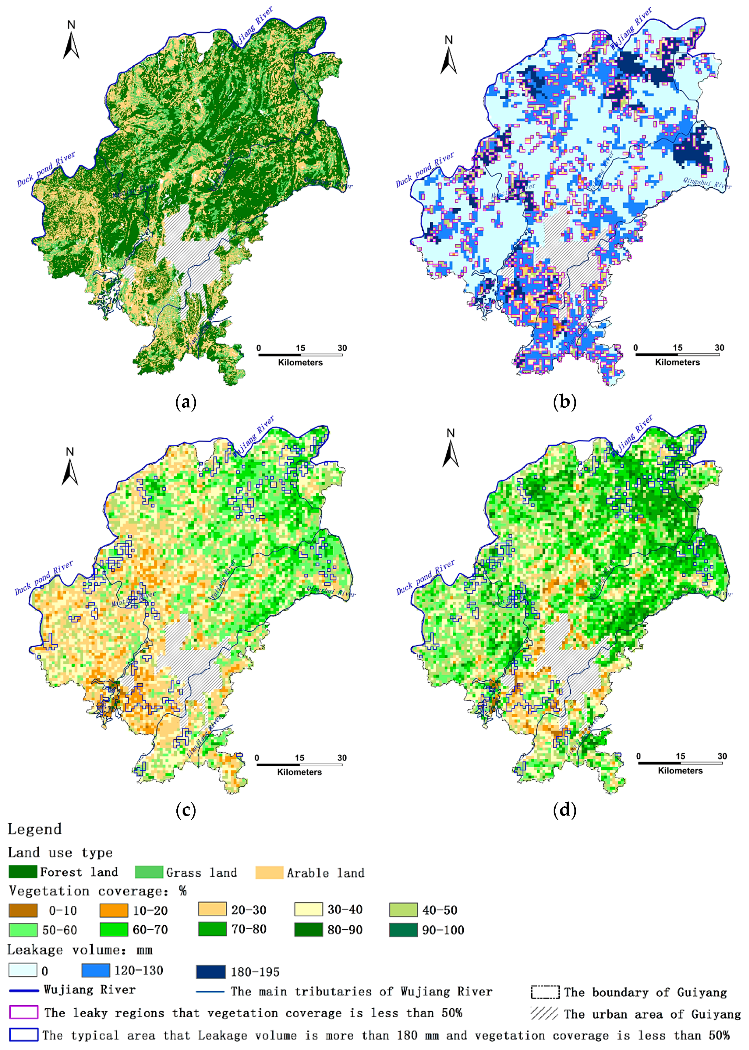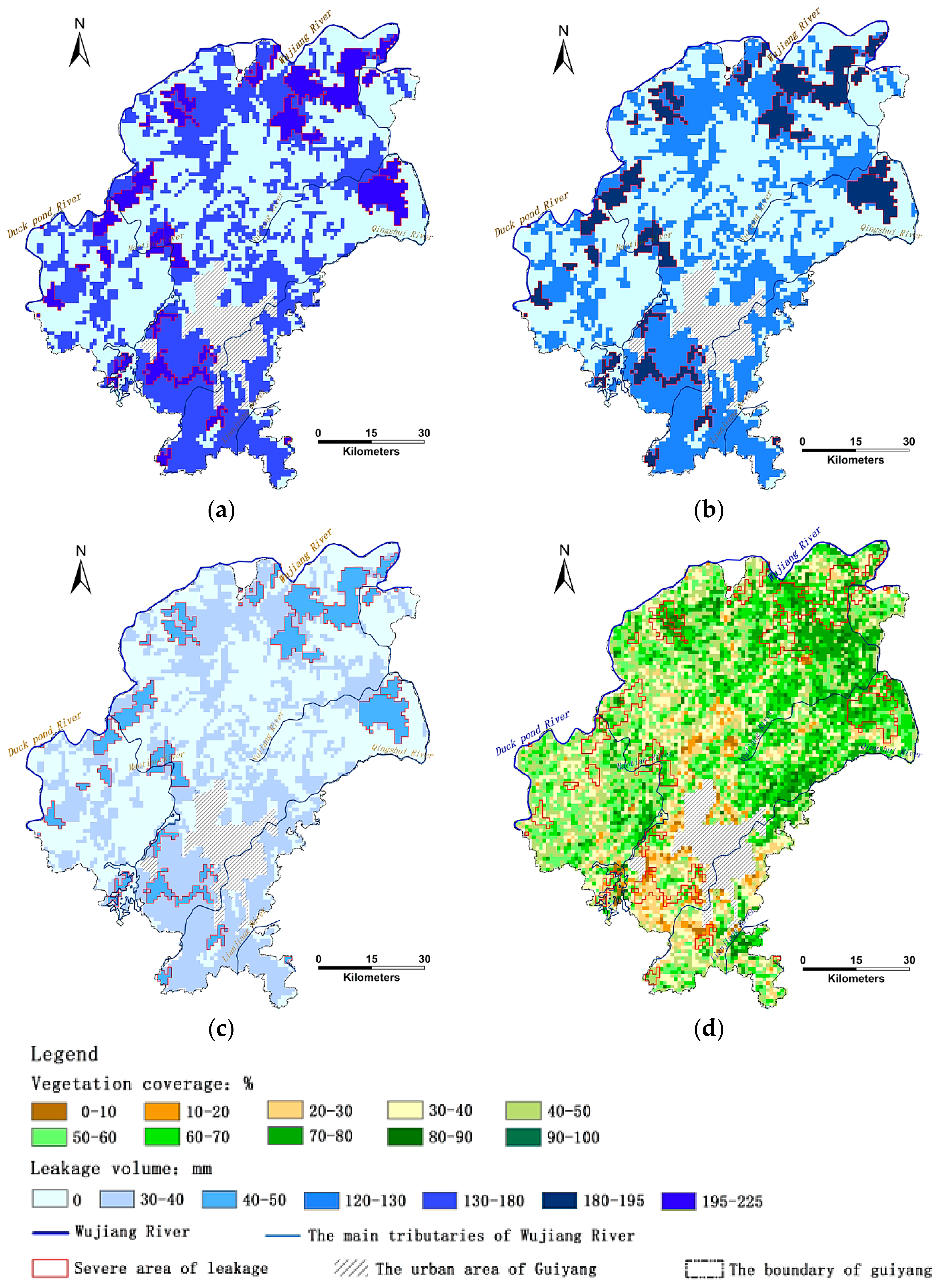 Spatial distribution of leakage volume in the environs of Guiyang: (a) in 2003; (b) in 2013; (c) as soil is thickened by 20 cm based on 2013; and (d) spatial distribution of severe leaky area and vegetation coverage in 2013. Note: The red boundary defines areas of severe leakage (>180 mm).