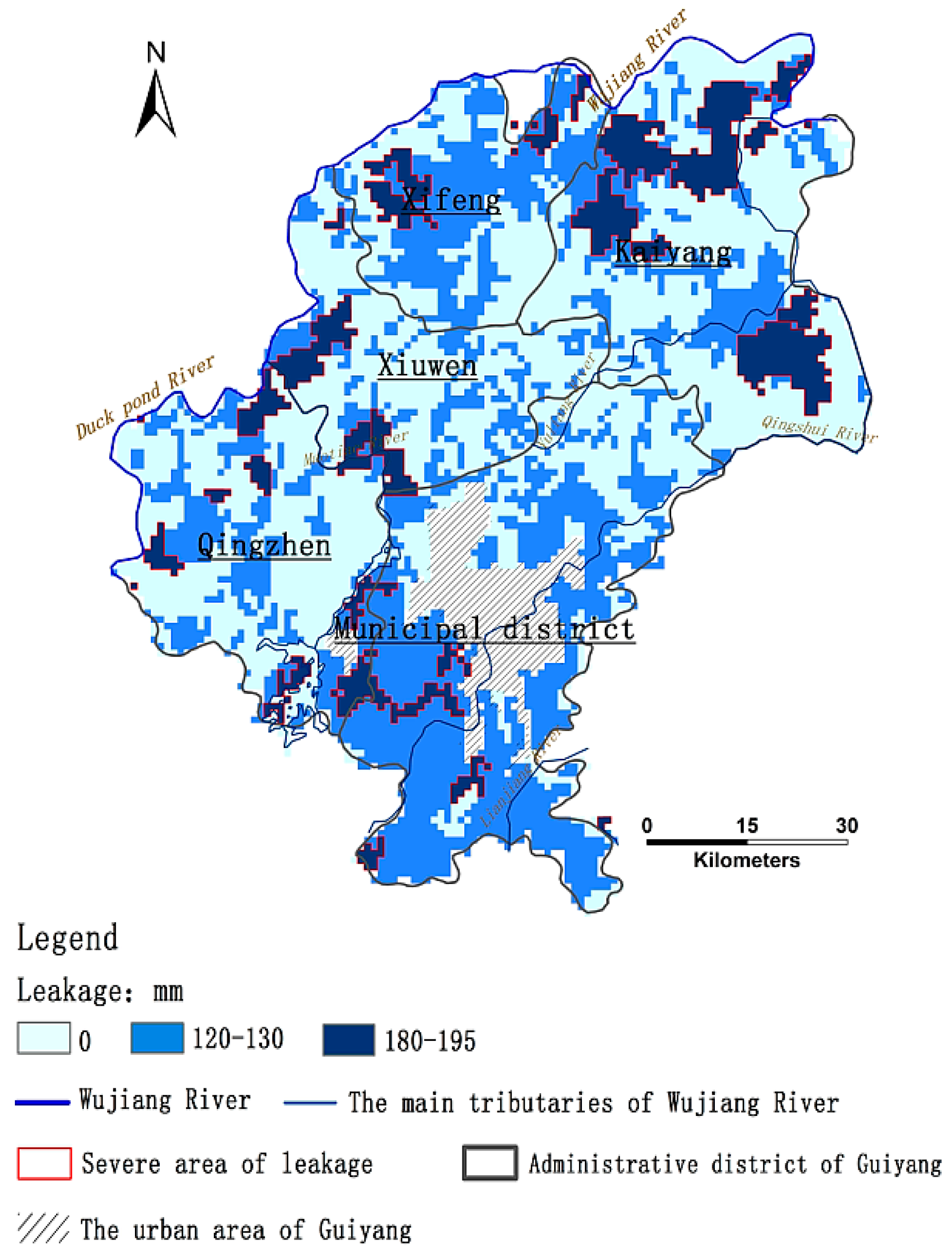 The distribution of leakage in each administrative district of Guiyang in 2013.