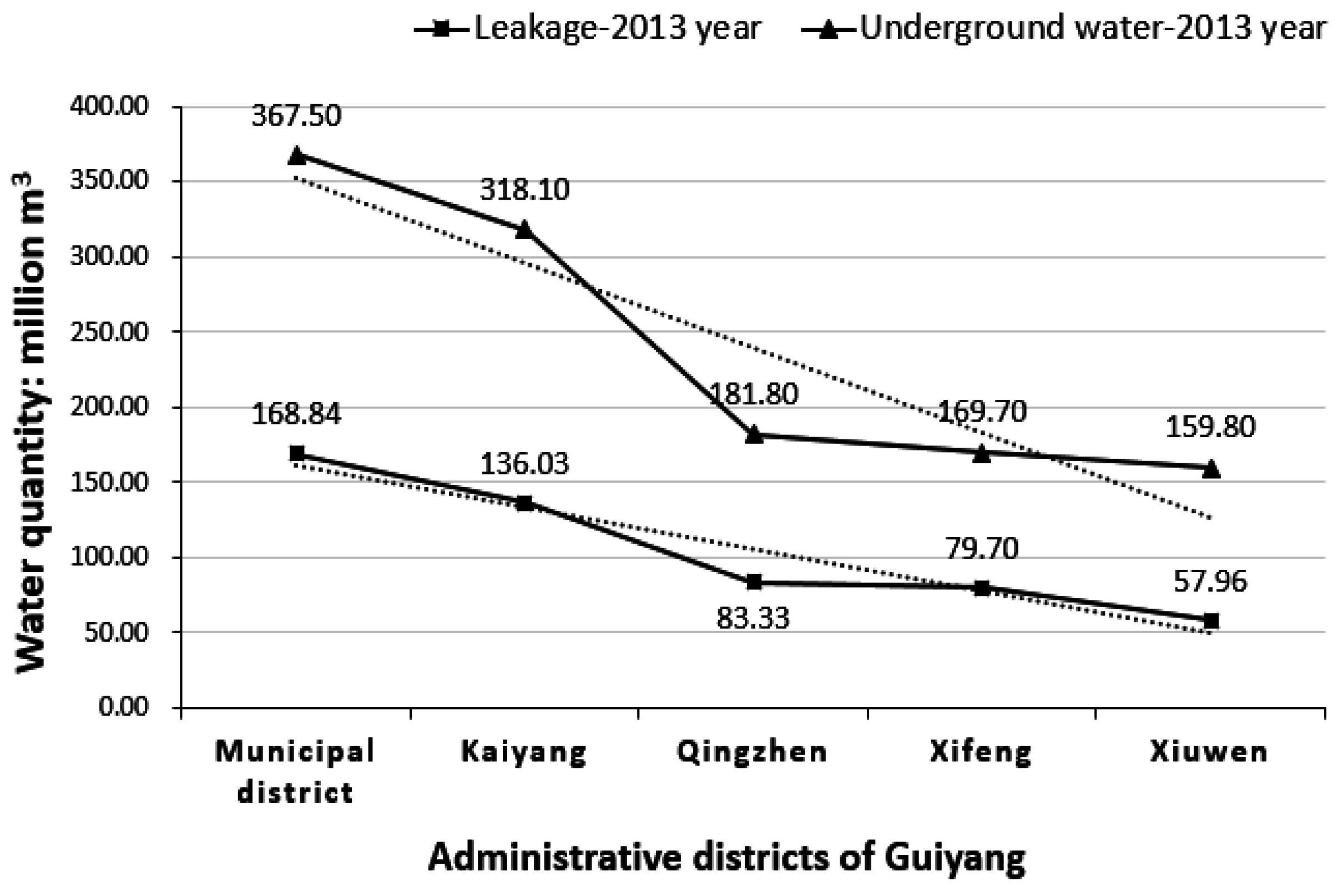 Second, in 2013, the simulation of leakage volume of each administrative district of Guiyang (Figure 7) has the same change trend as the quantity of groundwater issued by the Water Administration Department (Table 7 and Figure 8), which shows the simulation results have good credibility. The groundwater volumes of the administrative districts in 2003 were issued based on old administrative districts and boundaries; therefore, they are not suitable for comparison of the spatial distribution of groundwater with that of leakage in 2003.