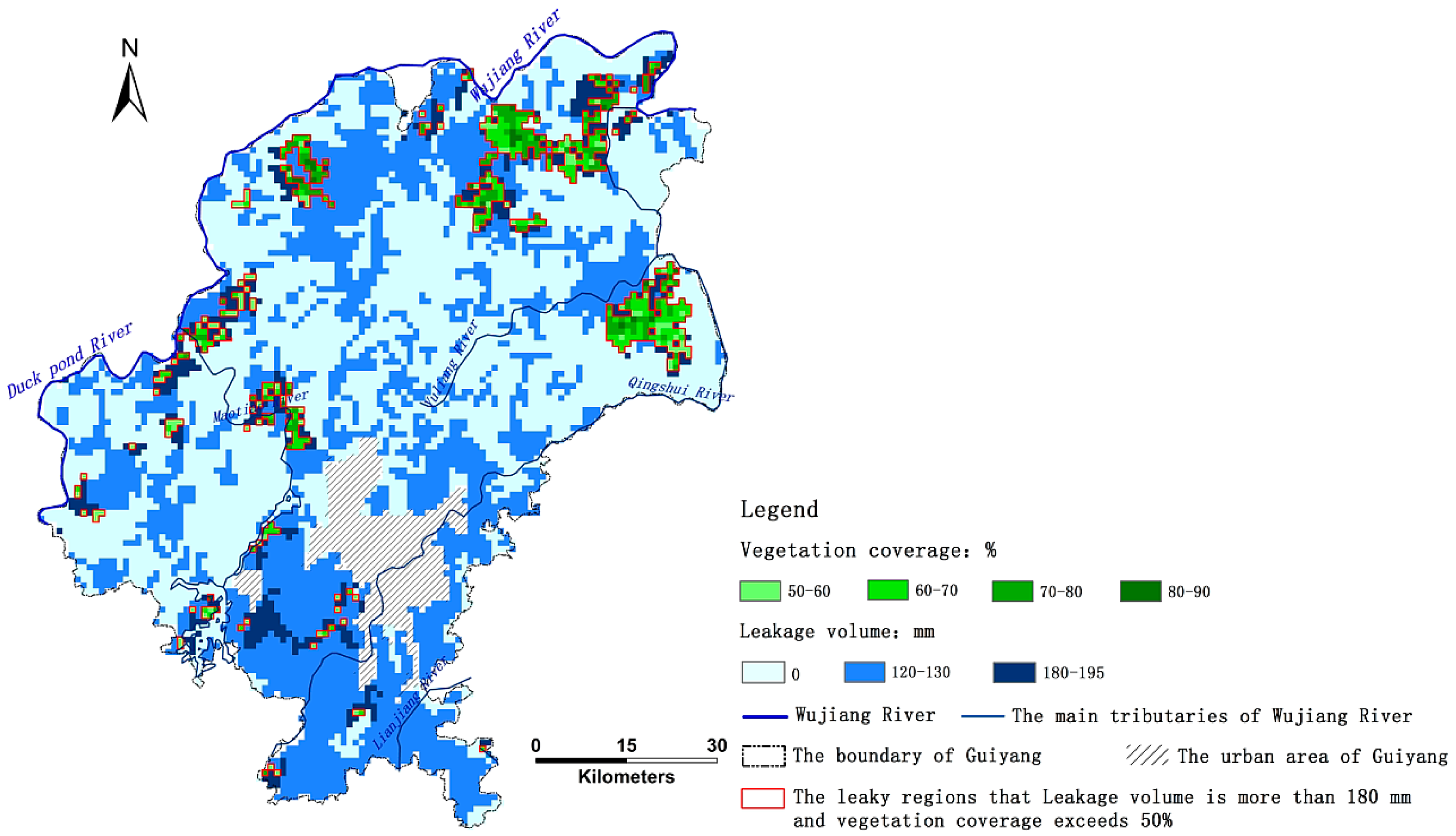 - In 2013, the precipitation volume in the environs of Guiyang was 922 mm, of which blue water and green water amounted to 463.38 mm (50.25%) and 458.68 mm (49.75%), respectively. The proportion of green water was far below the global average (65%). Furthermore, the leakage volume (70 mm) accounted for 15.16% of blue water and 7.62% of precipitation, which indicates the scope of the potential adjustment.