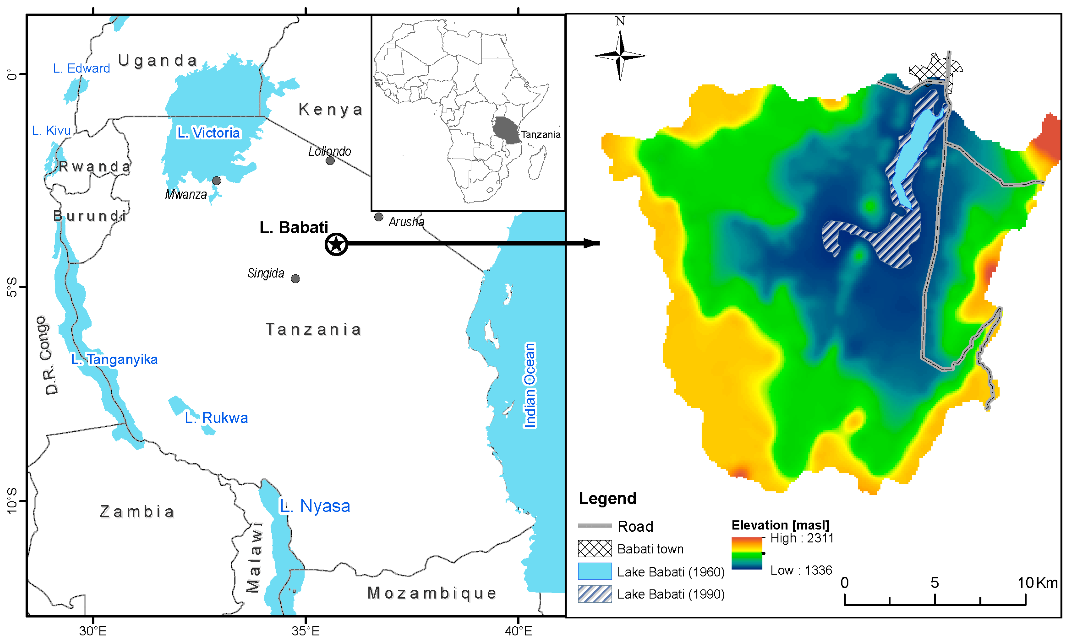 Lake Babati is located at approximately 35°45′ E and 4°15′ S about 200 km to the South West of the city of Arusha in northern Tanzania (Figure 1). It is a fresh water lake, with relatively shallow but highly fluctuating water levels [14]. The lake may have been formed following the East African Rift Valley floor uplift that resulted in the creation of both temporary and permanent lakes in the region, including the neighbouring Lake Manyara or Lake Burungi [22].