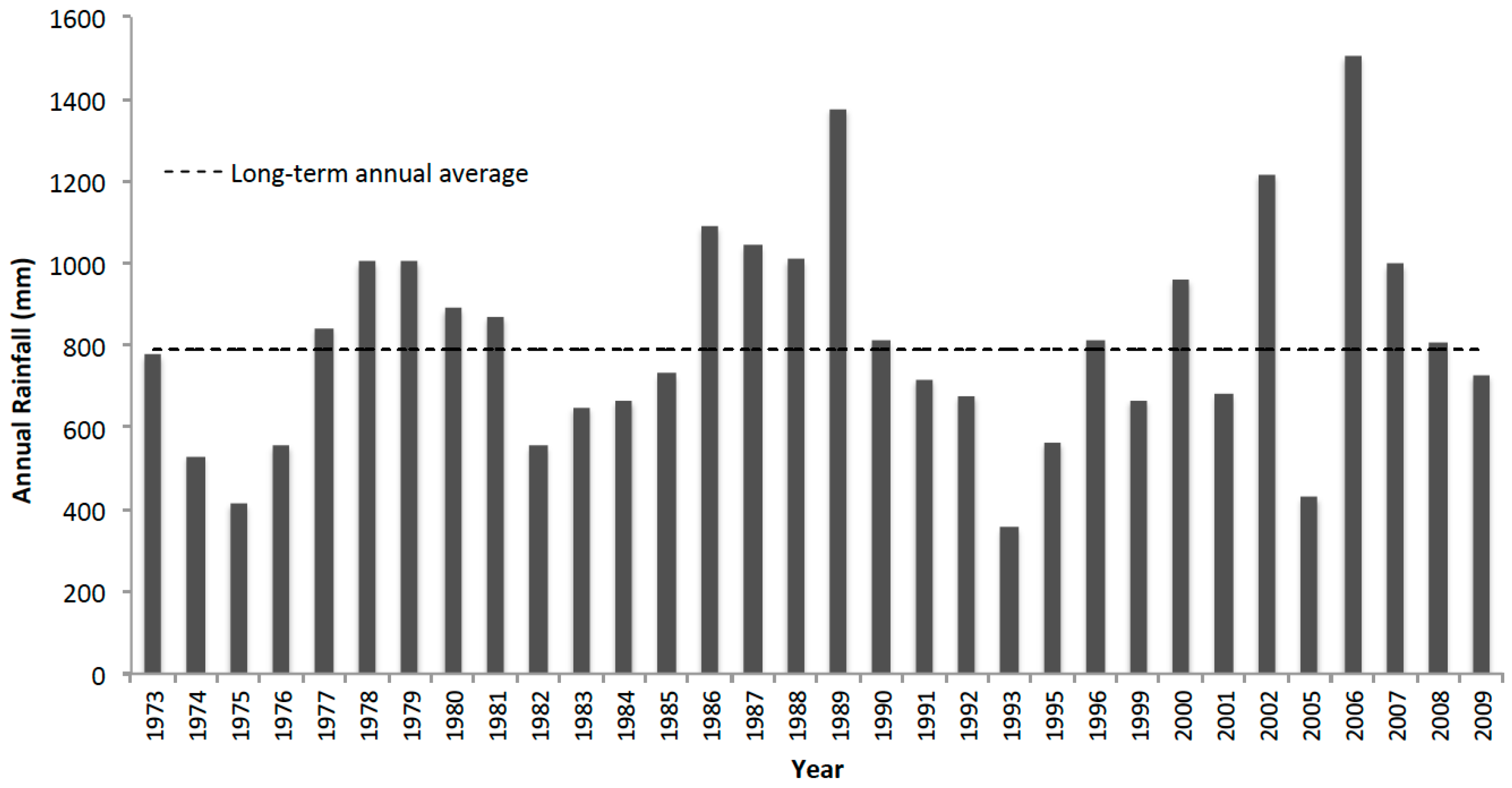 The region experiences two rainy seasons between October and May, separated by a short dry spell (January–February), with the rest of the year consisting of a dry season [20,27]. Records from Babati meteorological station between 1973 and 2009 indicate that the area receives an average rainfall of 789 mm per year, with a standard deviation of 278 mm (Figure 2). The data poorly correlates with records of neighbouring stations, such as Galappo Mission (13 km), Mulu (45 km) and Haubi Mission (63 km), indicating a complex spatial distribution of rainfall in the region ([20,21,28]). Previous work [27] suggests that the region is subject to large regional inter-annual variations in rainfall due to the El Niño-Southern Oscillation (ENSO) as well as orographically induced precipitation in the highlands. Rainfall records around the study area indicate that the topographic effect is 3.6 mm/year/100 m, explaining a relatively modest percentage (4%) of total rainy season precipitation between stations. The annual average temperature is 19.4 °C observed over the same period.