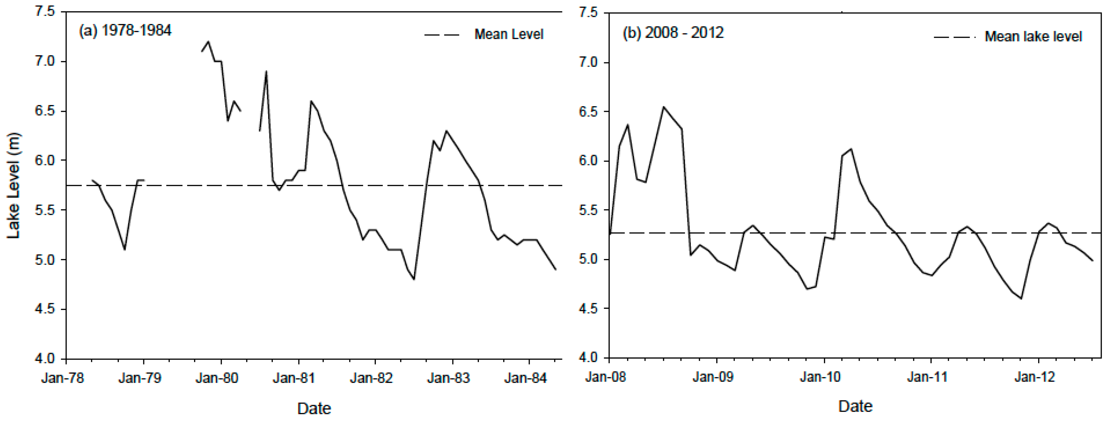 Lake level records for two different periods: (a) 1978–1984 and (b) 2008–2012.