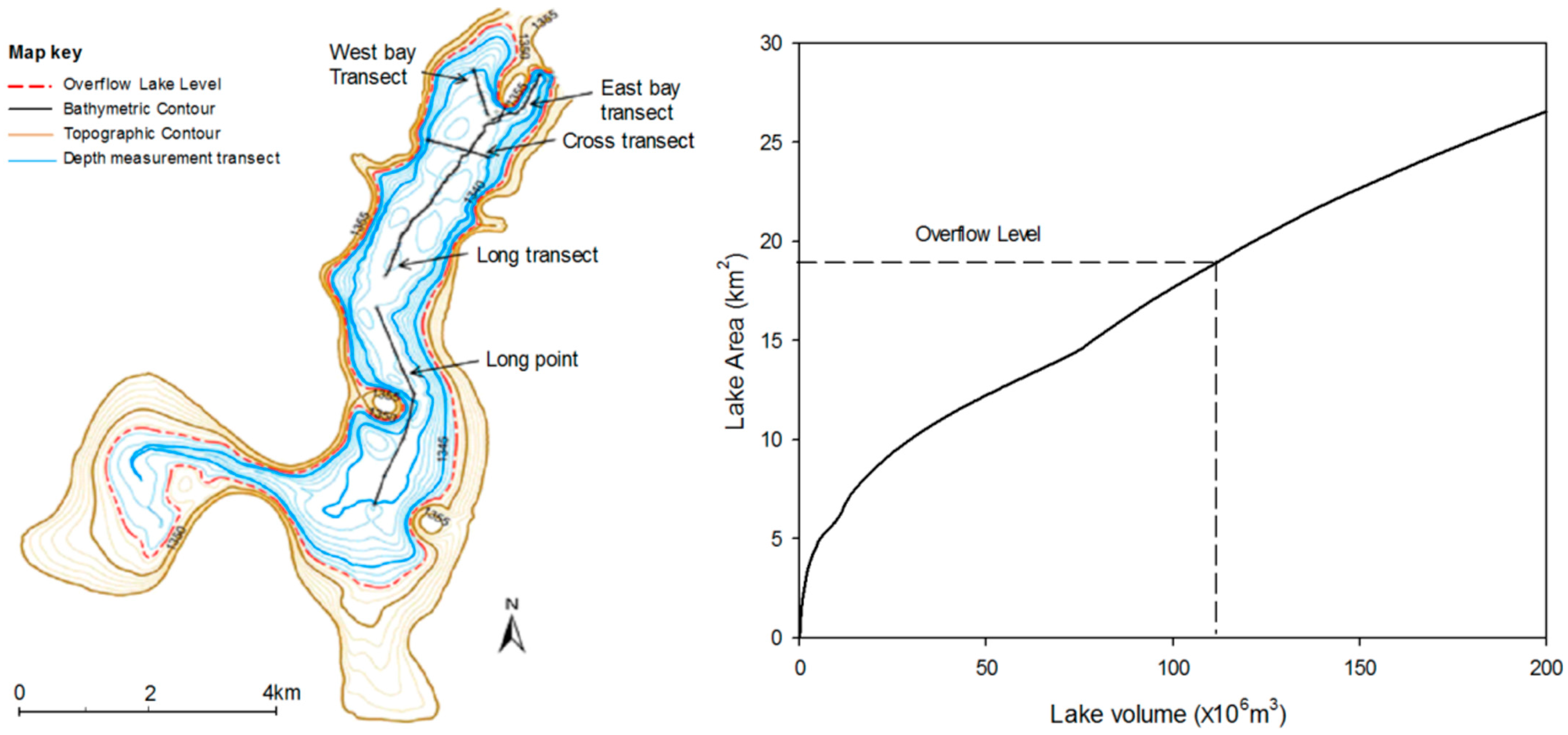 Lake Babati bathymetry (left) and area–volume relationship (right).