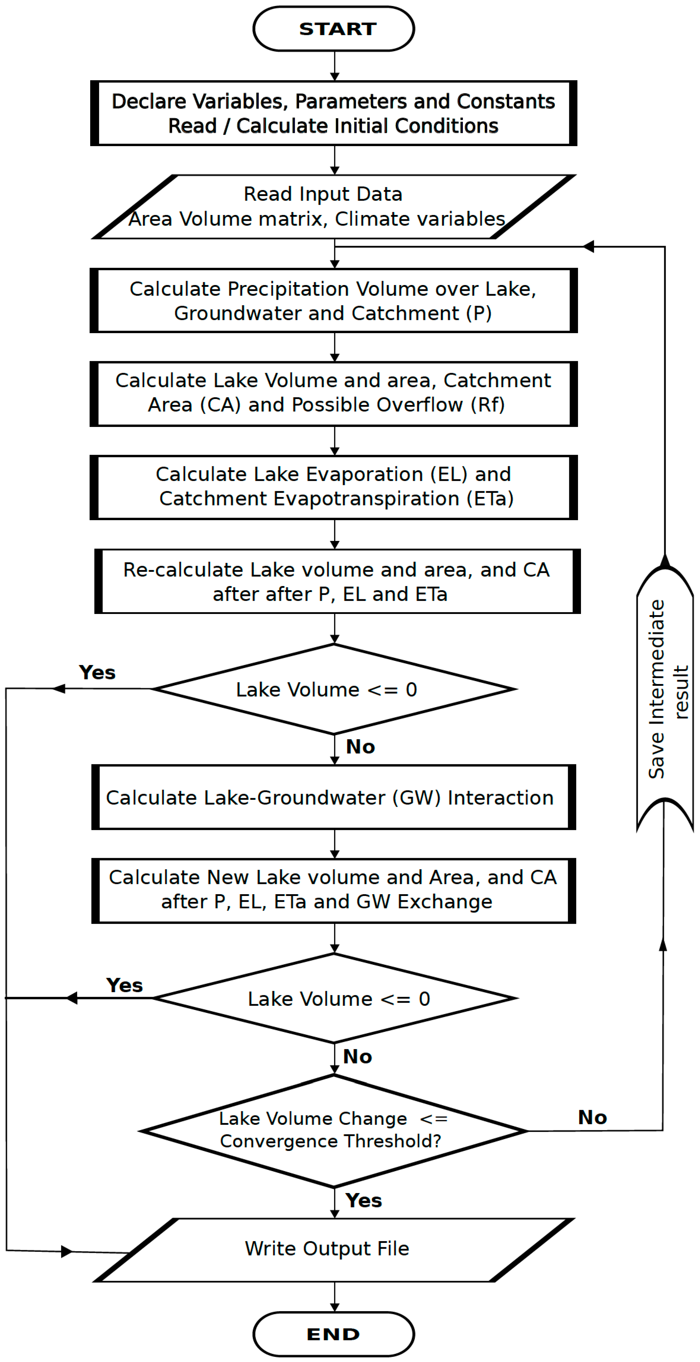 A Fortran-based program was developed to solve the mass balance (Equation (1)) following the calculation workflow in Figure 5. The program first calculates the net water volume change from the combined input (precipitation) and output (evaporation and groundwater leakage) fluxes at the end of a time step (1 year). Then, based on the area–volume relationship, the corresponding lake level change (positive or negative) is determined and used to update the lake level from the previous time step. The procedure is repeated iteratively starting from an initial lake water depth taken from observations until the lake level change between two successive iterations is small enough (<10 mm/year) or the lake has dried out completely. Upon convergence of a solution, the evolution of different water balance components over the simulation period is recorded in a text file for further analysis. The choice of the annual time step was motivated by data availability. Moreover, the annual time step was adequate since the study sought to establish the annual water balance of the lake-catchment system and assess the sensitivity to changes in long-term hydroclimatic conditions, rather than on seasonal dynamics such as in [3,51].