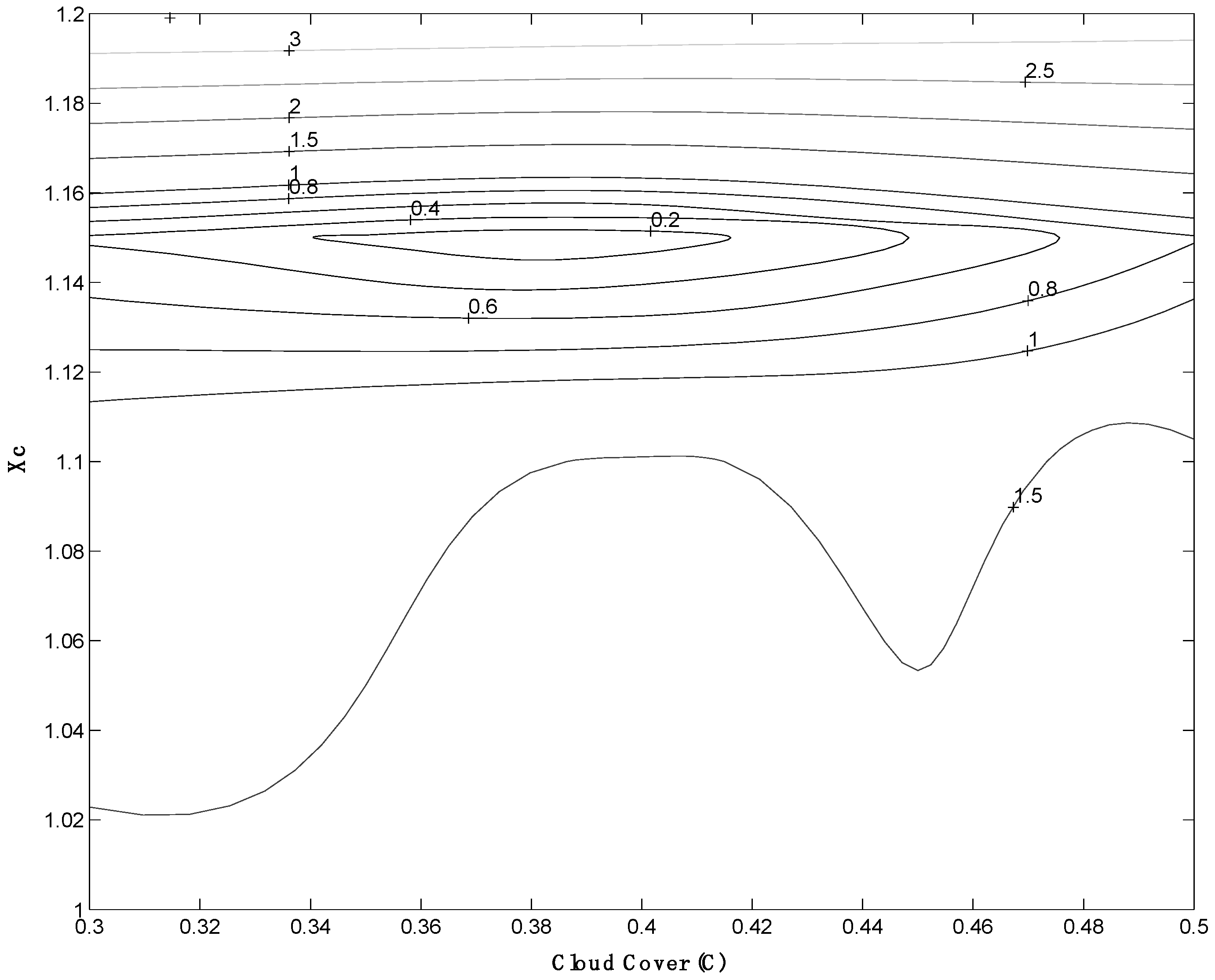 Model Response Map for calibration of cloud cover C and factor Xc (contour levels represent deviation between simulated and observed lake water level).