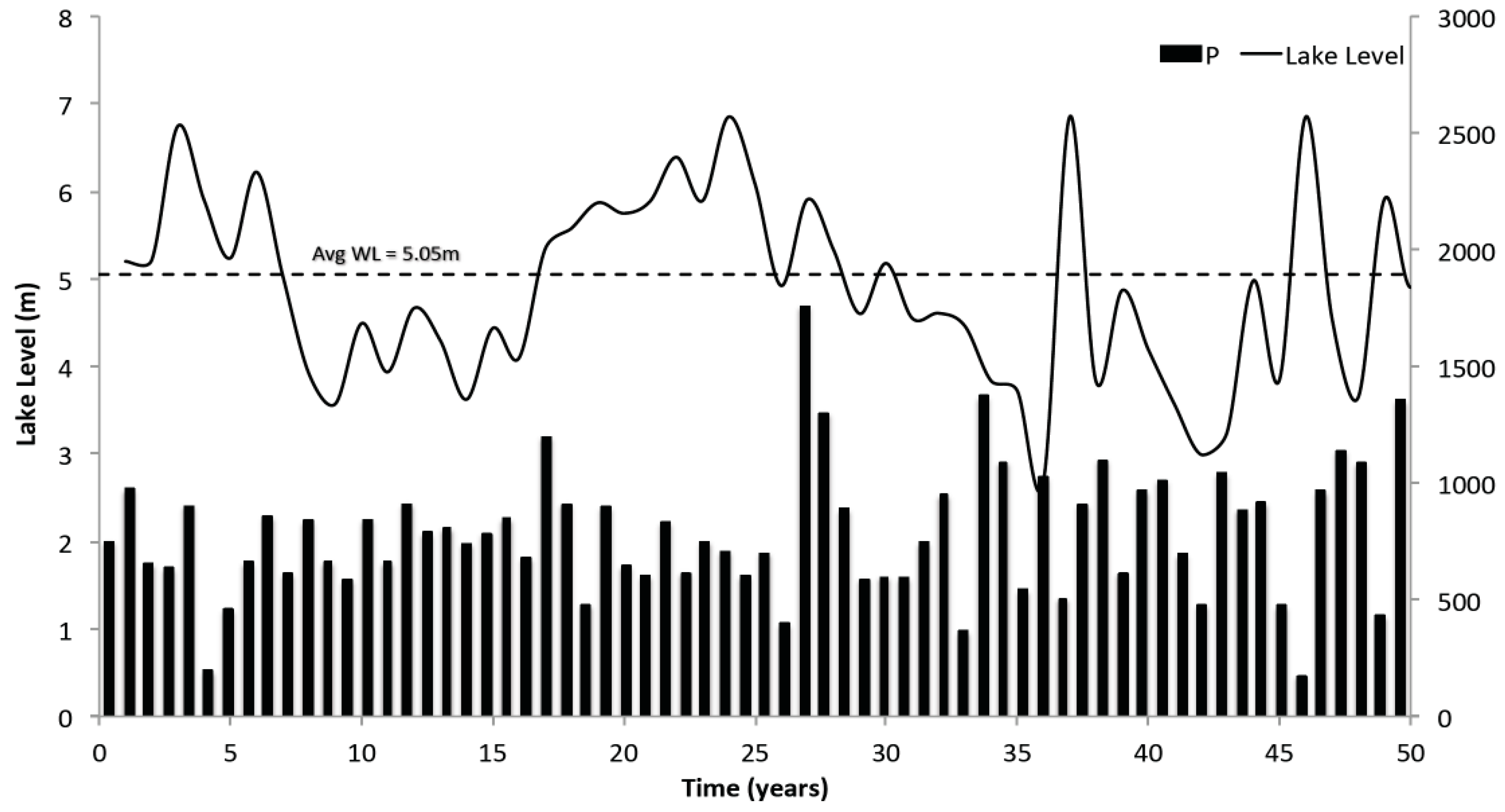 Simulation of Lake Babati level variation based on a 50-year random precipitation time series generated using historical mean and standard deviation values of precipitation for the period 1973 to 2009.