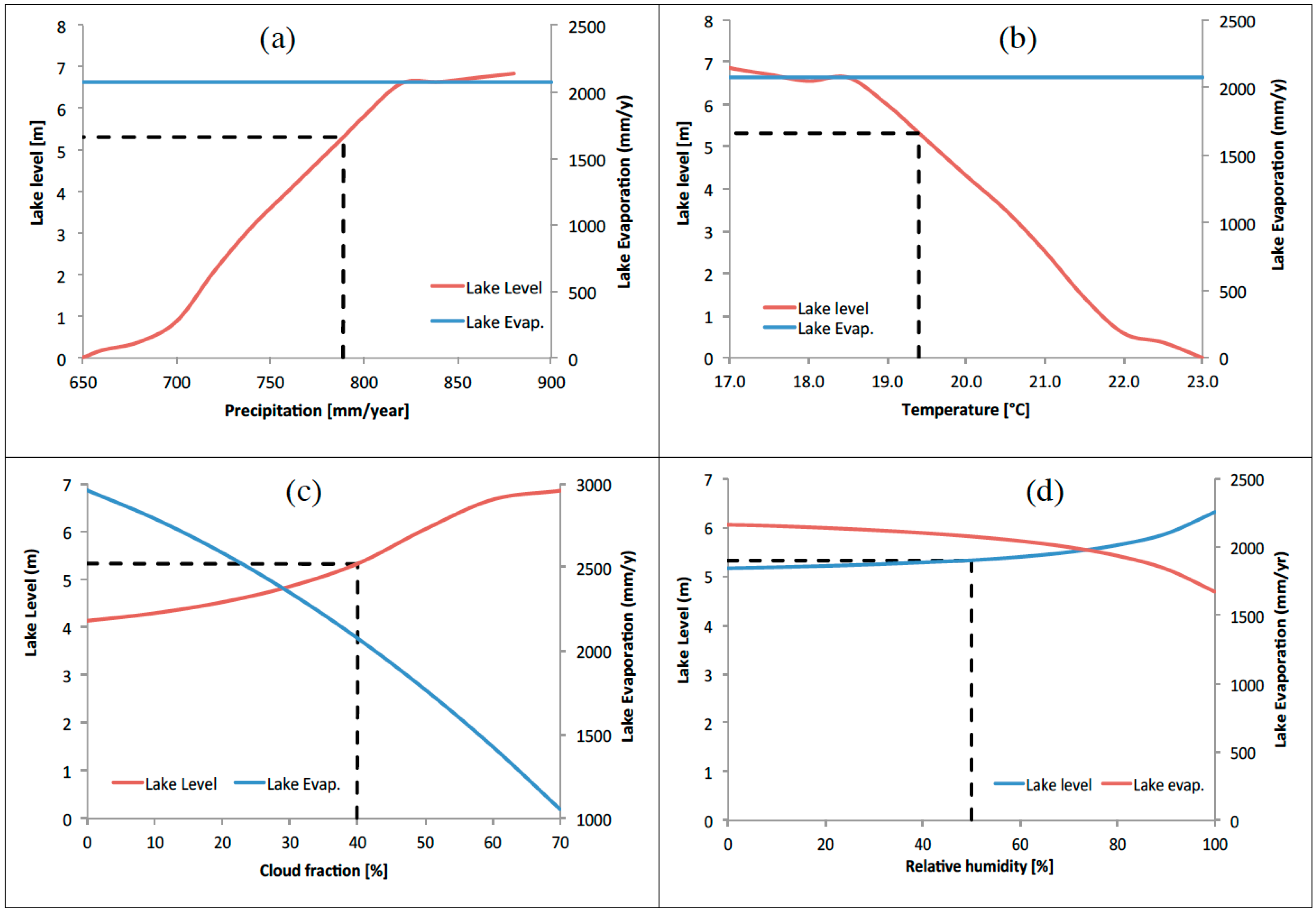 The lake level sensitivity to changes in precipitation, temperature, cloud cover and relative humidity are presented in Figure 8. The horizontal dashed lines represent the current lake level and the vertical dashed lines correspond to the current value (present conditions) of the respective parameter. It is observed that precipitation change has a relatively large impact on lake level (Figure 8a). For example, an increase of about 10% (90 mm/year) in annual average precipitation would lead to lake overflow (1.5 m rise), while a 17% (140 mm/year) decrease in rainfall results in dry-out conditions (5.3 m drop). In contrast to this, temperature changes inversely affect lake levels (Figure 8b) with a 2.4 °C temperature decrease from present conditions resulting in lake overflow while a 3.6 °C increase leads to lake dry out.