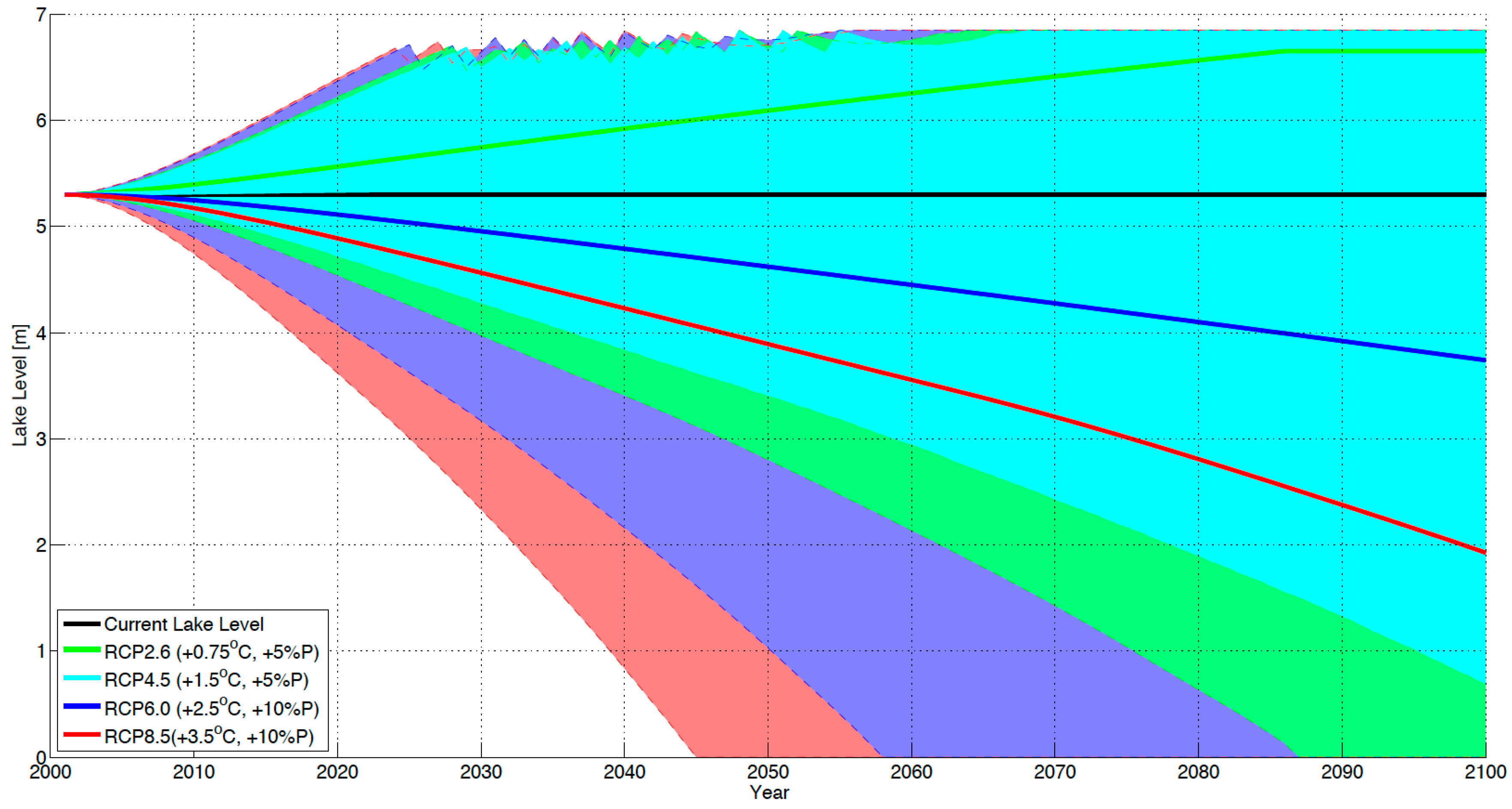 The solid lines of Figure 9 show the lake response to the ensemble mean projection of changes in temperature and precipitation over the 21st century, for different climate forcing scenarios (green—RCP2.6: cyan—RCP4.5; blue—RCP6.0; red—RCP8.5). Two distinct lake evolution patterns can be observed, depending on the relative importance of the opposite effects of temperature and precipitation. The first pattern brought about by the RCP6.0 scenario (+2.5 °C, +10%P) and RCP8.5 (+3.5 °C, +10%P) indicates that the current lake level will drop by 1.6 m and 3.4 m, respectively, at the end of the century. Volumetrically, this corresponds to 61% and 93% reductions at the end of the century. Such depletion would directly impact the water supply availability for Babati town and would have serious implications on the sustainability of the lake aquatic ecosystem (e.g., hippos, fish and birds).