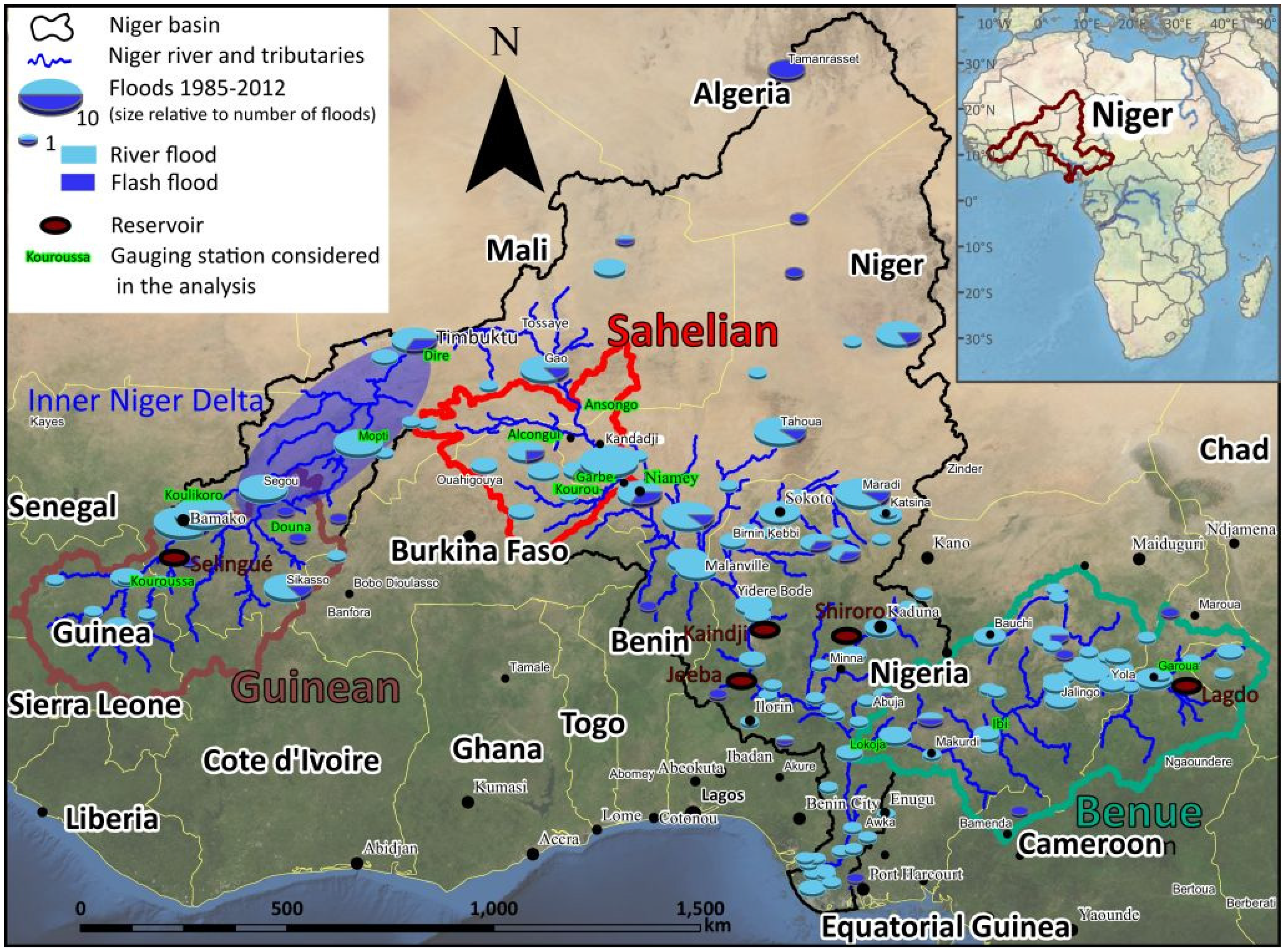 Niger River Basin: Source areas of floods in the Guinean, Sahelian and Benue regions, with location and number of catastrophic floods plotted for river and areal floods [29,30,31]. Discharge gauging stations used for analysis are marked in green and reservoirs as red ovals [32].