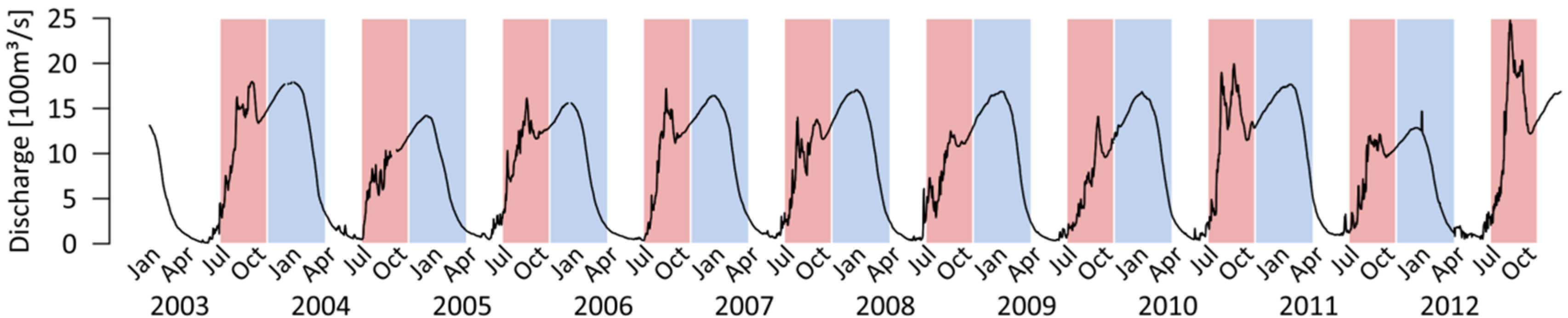 Most of the inflow in the middle section of the NRB comes from the plateaus of the right-bank subbasins. The vast subbasins to the left reach up into the central Sahara but only contribute a minor amount of inflow, and local tributaries are endorheic most of the time [2]. The annual peak during the rainy season (July to November) in the mid-section of the Niger downstream of the IND is called the “Red Flood” or “Sahelian Flood”, the latter of which will be used in this study for the second subregion. It is defined as subcatchment between Ansongo and Niamey. The third flood we focus on here is the flooding of the Benue River, which flows into the Niger at the Nigerian city of Lokoja. Coming from a high-altitude plateau, it is the largest tributary in terms of discharge and surpasses the Niger by about one-third at the confluence near Lokoja. This part of the NRB will henceforth be referred to as “Benue”. Finally, the Niger flows into the Gulf of Guinea, forming the Niger Delta, a flat region characterized by swamps and lagoons [37]. As no discharge data were available for the region between Yidere Bode and the confluence of the Benue, nor for the part after the confluence, these parts are not included in the analysis.