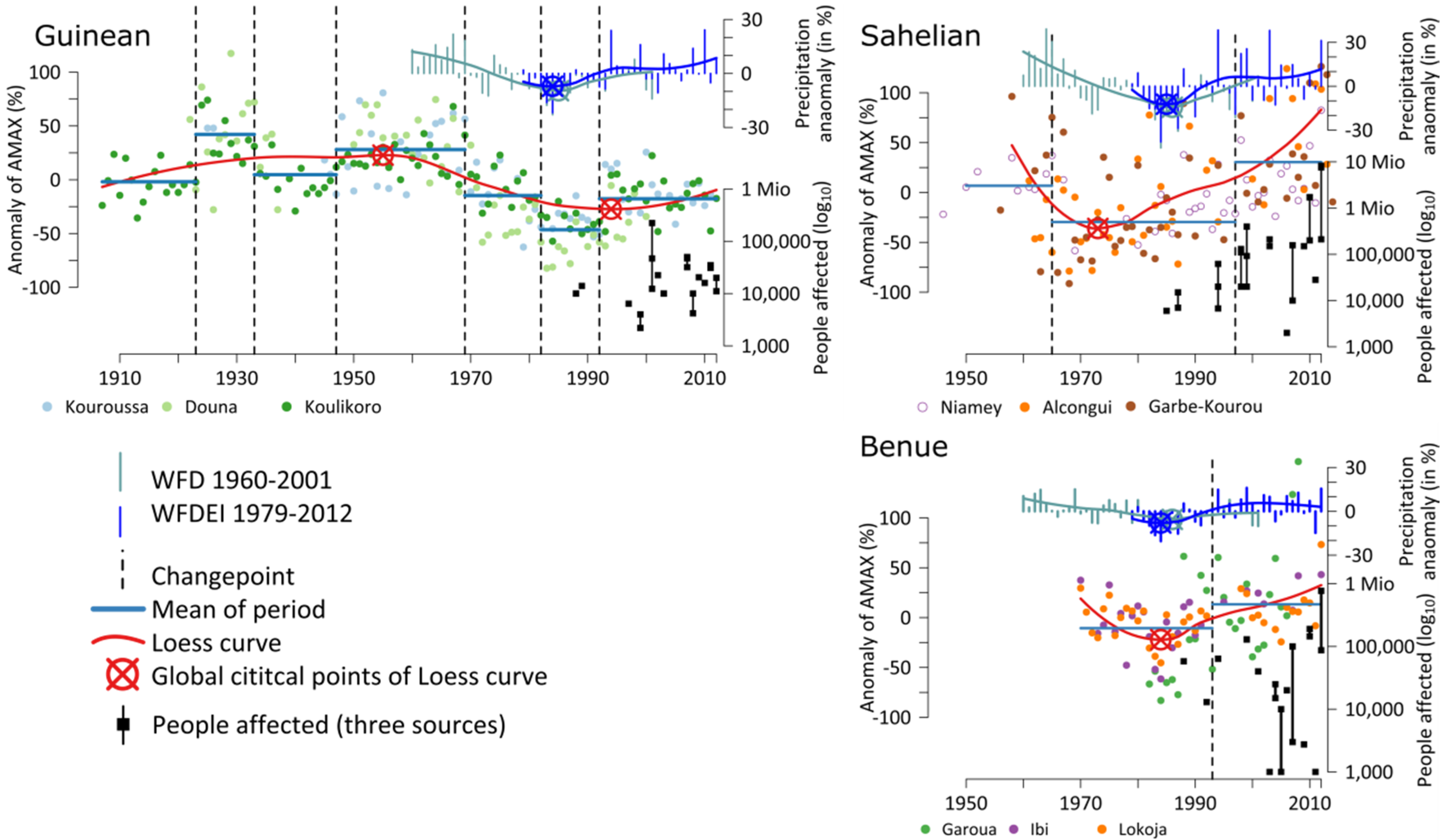 Top: Annual maximum discharge (AMAX), precipitation and people affected by floods in the NRB, separated for the three subregions. Detected changepoints for the mean AMAX in each region are plotted as black dashed lines. Note that for the Sahelian region the numbers of people affected by catastrophic floods are plotted for the whole Middle Niger (see Section 3.1.2). Please also note for the Sahelian region that only stations on the tributaries (Alcongui, Garbe-Korou) have been used for the Loess curve. The station Niamey has gaps where the red flood was covered by the Guinean flood in the hydrograph.