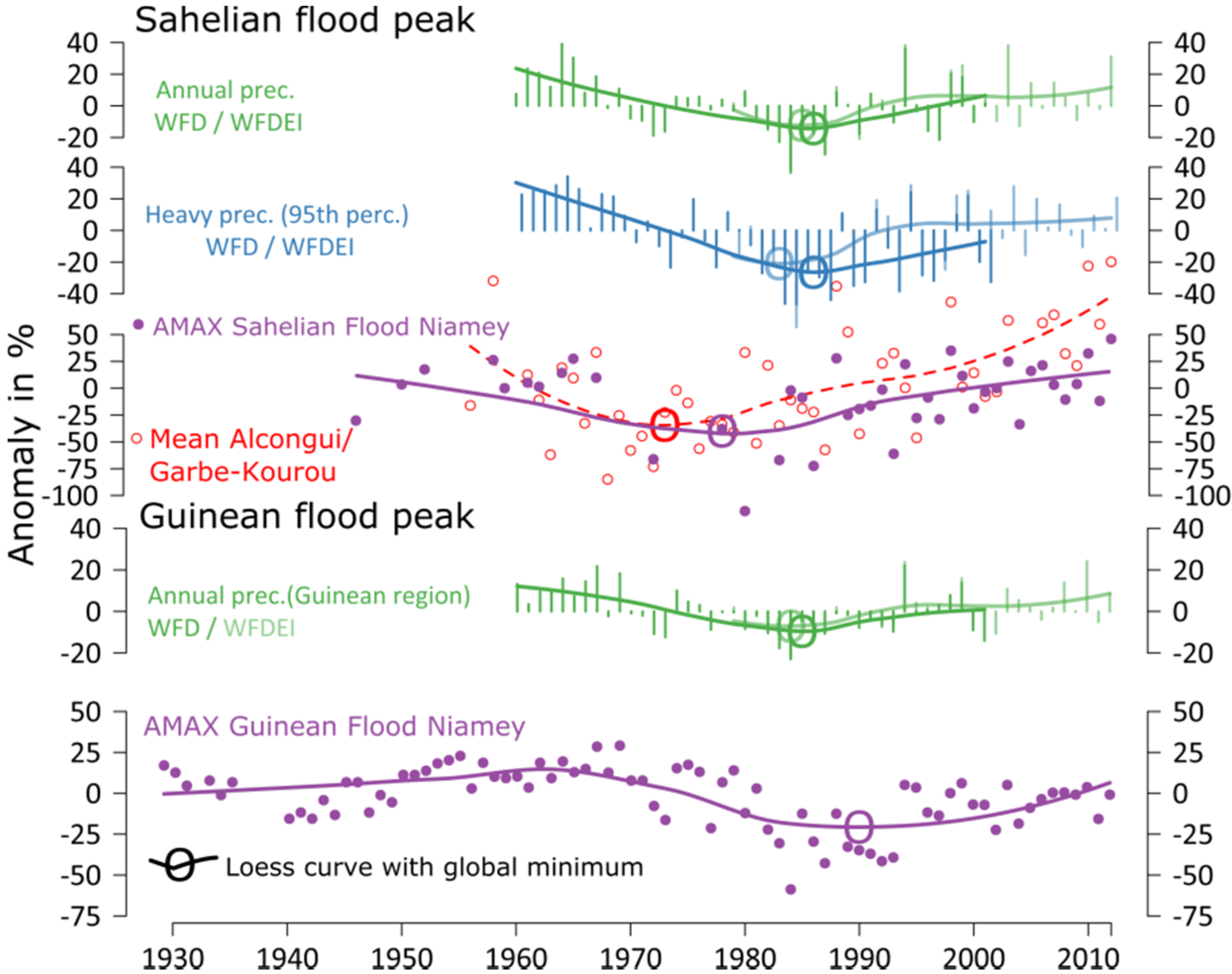 Sahel Paradox depicted with annual/ heavy precipitation from WFD and WFDEI and AMAX for the Sahelian flood peak at Niamey, and the mean of Alcongui and Garbe-Kourou. The AMAX of the Guinean flood peak at Niamey is depicted with the respective precipitation in order to illustrate the difference. All time series as anomalies in % with Loess curves and global minima.