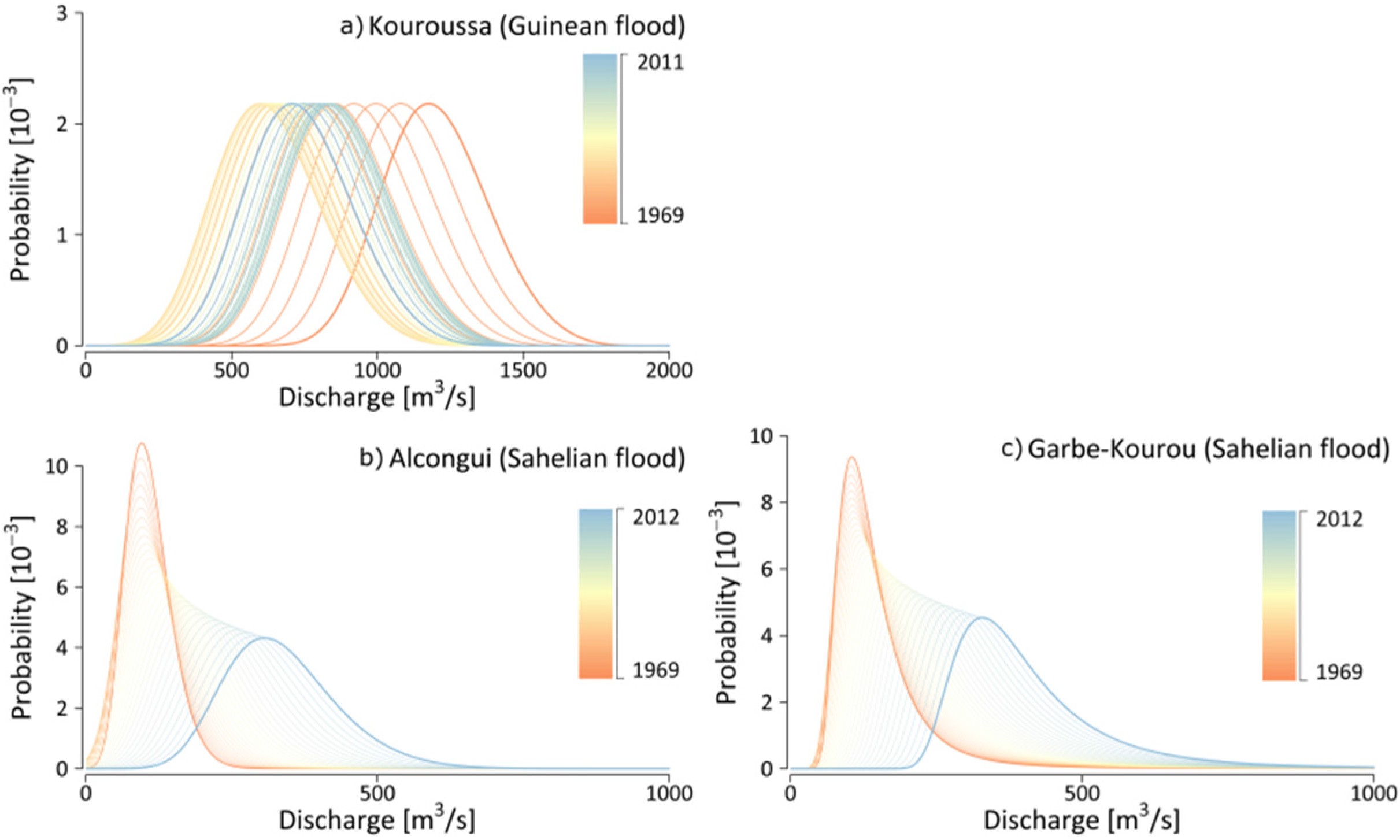 In contrast, the time series of the Sahelian tributaries Gorouol (Alcongui) and Sirba (Garbe-Kourou) can be explained with the best model fit by second degree location parameters and linear scale parameters. The NSGEV for these time series show not only the same characteristics but also similar probability values, which adds confidence to the result. For both stations, the peak moved from approximately 150 m³·s−1 to 300 m³·s−1, with an increasing rate at the end. The distributions of both of the latter stations become linearly flatter over time, which implies that the probability of the highest peak is decreasing but the probabilities of distinctly higher or distinctly lower discharges are increasing. In addition, the peak of the distribution is moving to more discharge with increasing intervals over time, implying an exponential increase.