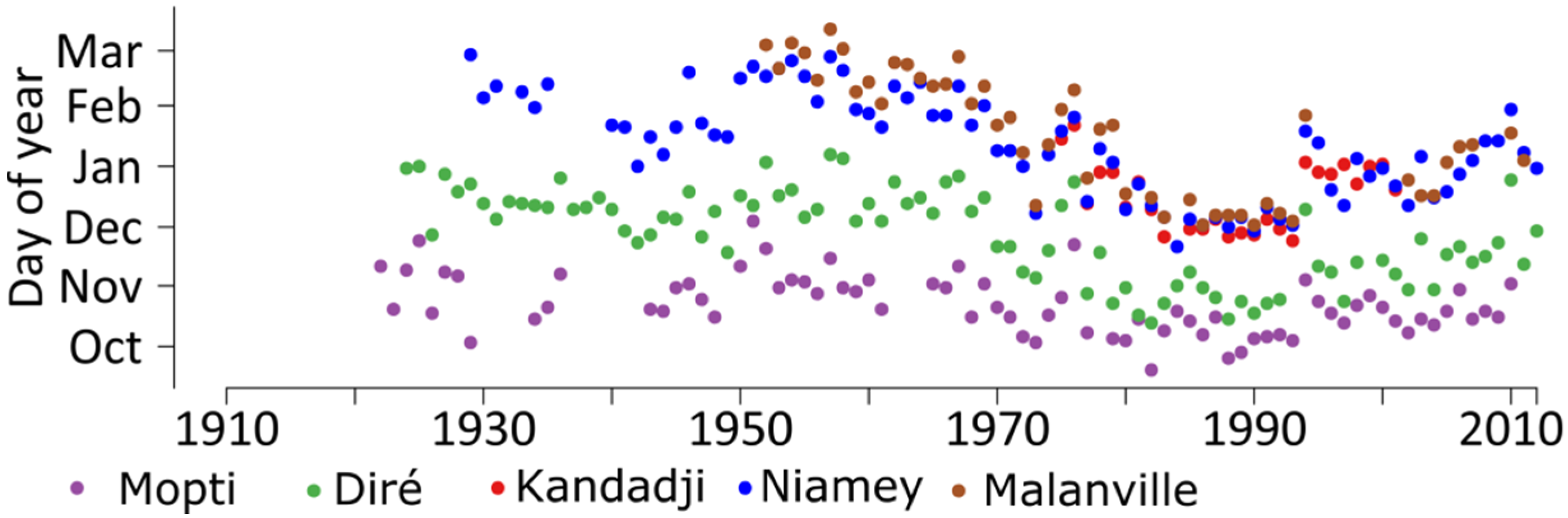The temporal occurrence of AMAX (day of the year) was analyzed for all regions. No significant trend could be detected except for the stations downstream of the IND (Figure 7). Here, AMAX timing of the Guinean flood shifted from February/March in the 1950s and 1960s to December/January in the 1970 to 1980s, and since then occurs again slightly later during January/February (see e.g., for the Malanville station in Figure 7). Due to the absence of temporal shift in other parts, the temporal shift of AMAX downstream of the IND is very unlikely to be a result of shifts in the rainfall regime, but may be explained by retention processes within the IND: water from the Guinean subregion accumulates in the delta and only a limited amount can pass through its outlet near Diré at any time. In the time periods of generally lower AMAX (as e.g., during the 1980s to 1990s), the floods reached the downstream stations considerably earlier in the year, whereas higher AMAX values as observed in the 1950s or 2010 resulted in a delay of the AMAX at gauging stations affected by the retention processes of the IND.