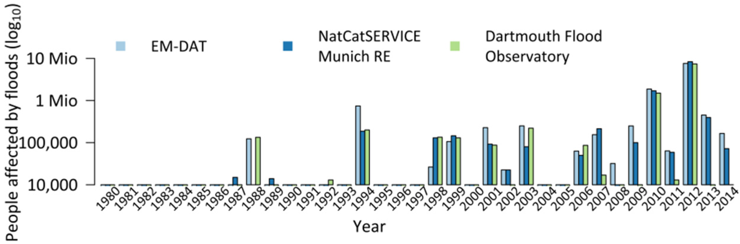 People affected by catastrophic floods per year in the Niger River Basin from 1980 to 2014 for three different data sources. Note that the scale of the y-axis is logarithmic.
