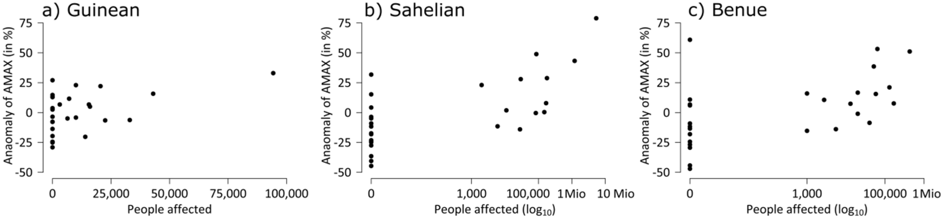 Correlation between AMAX and people affected by floods for the subregions of the Niger basin, (a) Guinean, (b) Sahelian and (c) Benue. The scales for people affected by floods for the Sahelian region and the Benue are logarithmic. Please note that the number of people affected for the Sahelian basin comprises the whole Middle Niger (See Section 3.1.2).