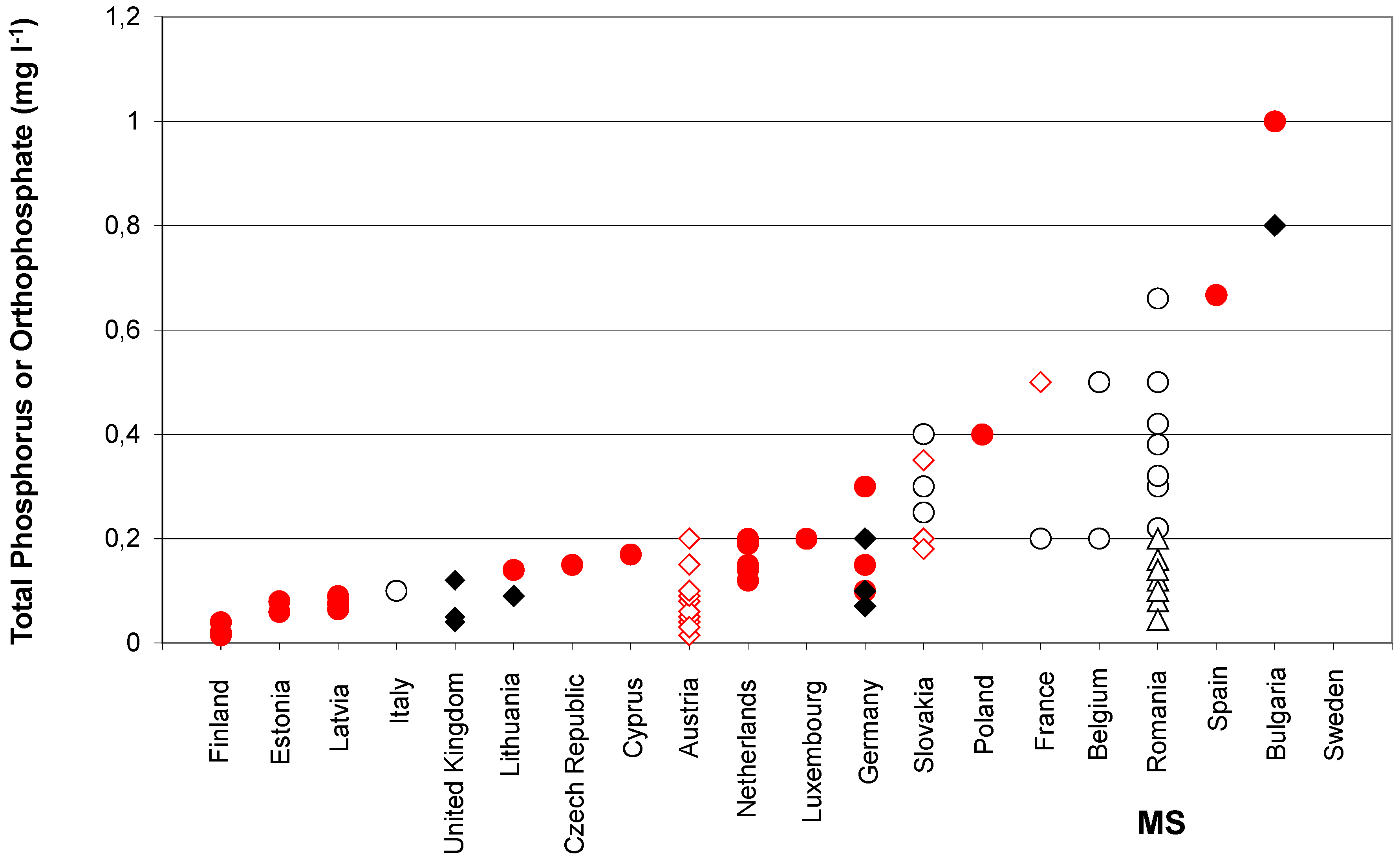 Total phosphorus or orthophosphate values for good-moderate boundaries of ecological status in European streams and rivers. Filled circles = Total phosphorus as annual mean values or mean values for defined seasons or no entry. Open circles = Total phosphorus as 90 percentile values of annual measurements. Triangles = Total phosphorus median values. Filled diamonds = Orthophosphate/soluble reactive phosphorus as annual mean values. Open diamonds = Orthophosphate as 90 percentile values of annual measurements. Values provided by CZ, FR, BG, PL, LT, LU, CYP and IT are good-moderate boundaries set for “All rivers” (without typological differences). Multiple points for other MS denote good/-moderate boundaries set for different river and stream types. Sweden reported good-moderate boundaries as EQR (not shown). Spain reported a value with unknown unit of measurement (mg/L−1 or EQR). UK values refer to soluble reactive phosphorus.