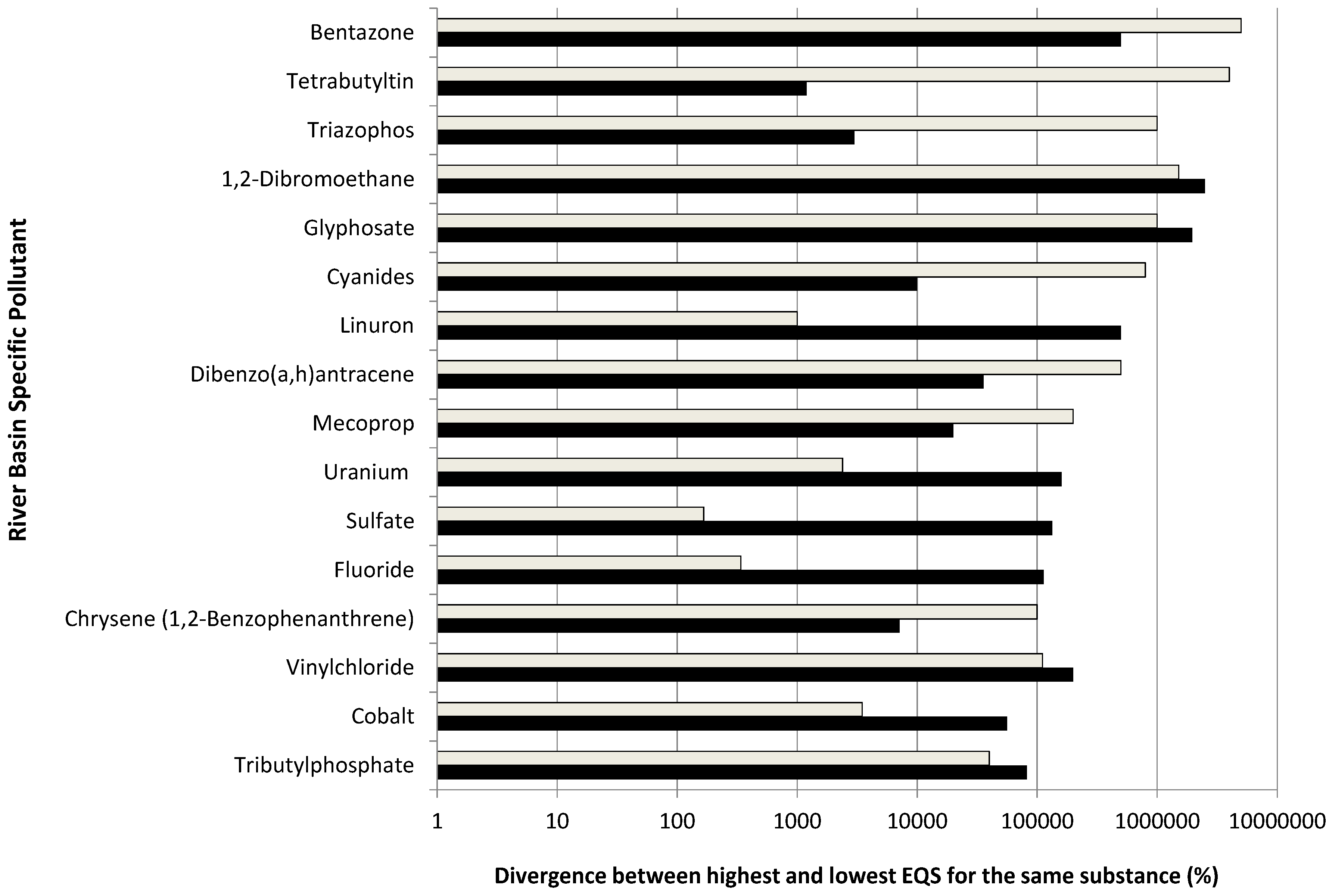 Divergence (in %) between minimum values and maximum values of EQSs for RBSPs reported by different MS. 16 substances are shown exemplary. Medium of measurement for the substances = water. Grey bars = values reported by Arle et al., 2012 [22], Black bars = values reported by Irmer et al., 2014 [23]. Under the WFD, EQSs for RBSPs are derived according to fixed rules which should eliminate flexibility in the determination of standard values. Similar to the quality standards for substances under the chemical status classification, the EQSs for RBSPs should show identical values.
