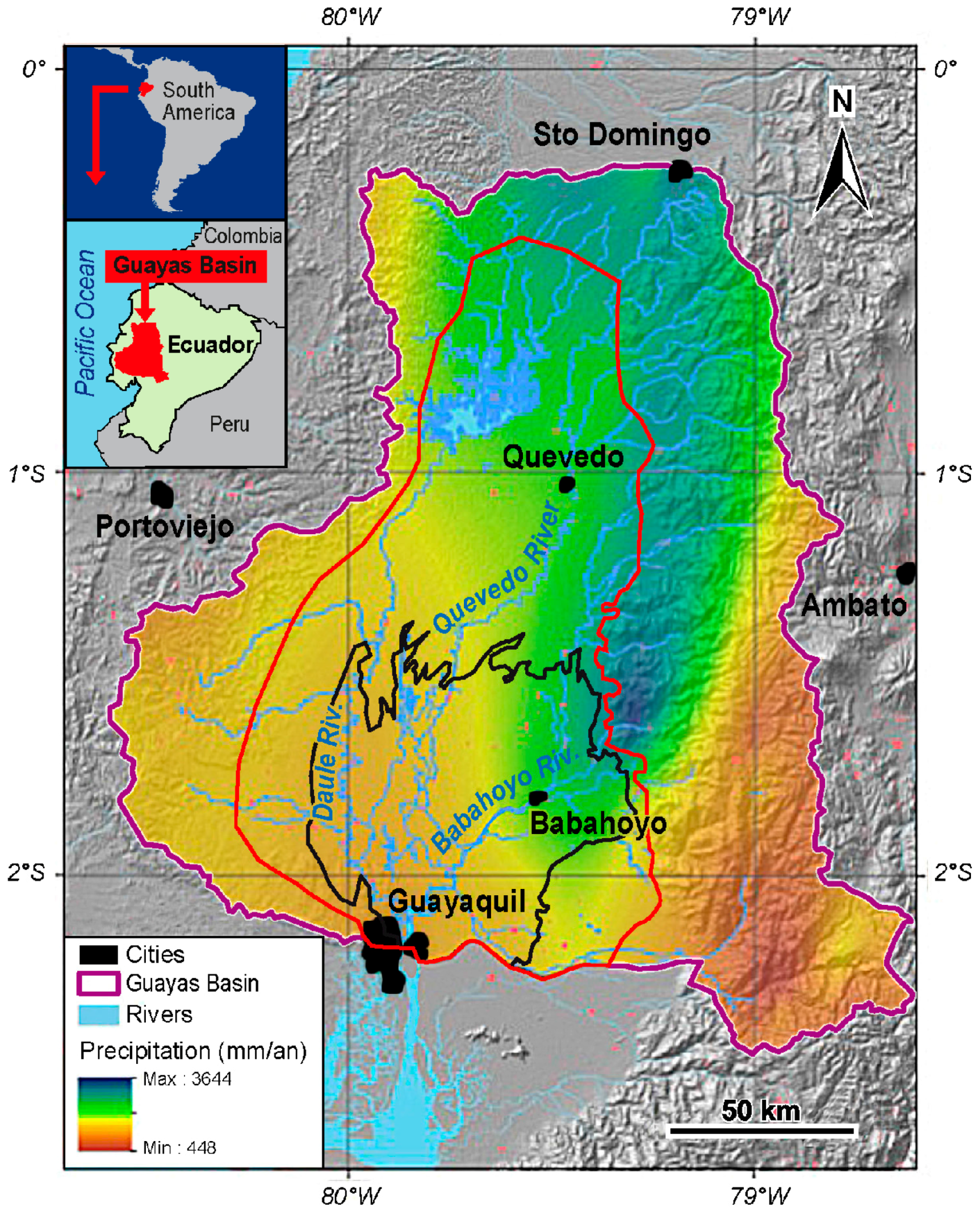 The Guayas Basin (boundary in purple) is located in the southwest Pacific slope of Ecuadorian Andes. The lowland (boundary in red) occupies 15,000 km2 of the 32,300 km2 of the watershed area, and the floodplain 5000 km2. The mean annual rainfall isohyets map was elaborated for the 1963–2009 period using cokriging method.