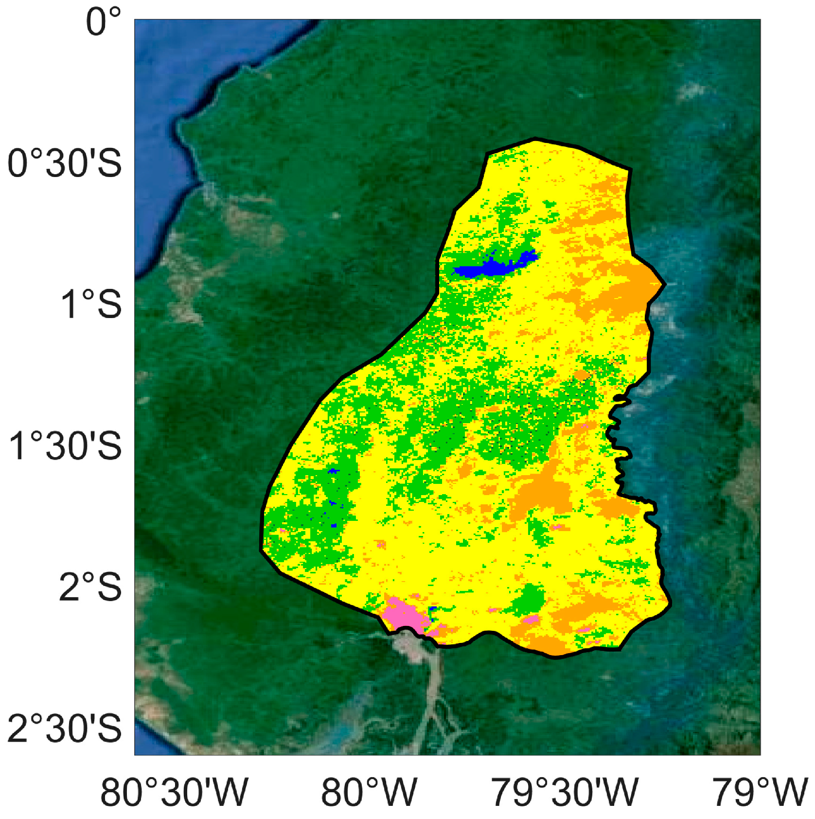The five classes correspond to open water (lakes and reservoirs) as the Guayas river stream and its tributaries cannot be identified at a spatial resolution of 1 km, permanent crops composed of tropical arboriculture (banana, oil palm, coffee and cacao trees), seasonal crops (mostly rice, corn, soya, and shrubby vegetation), mostly pastures and sugar cane, towns, respectively.