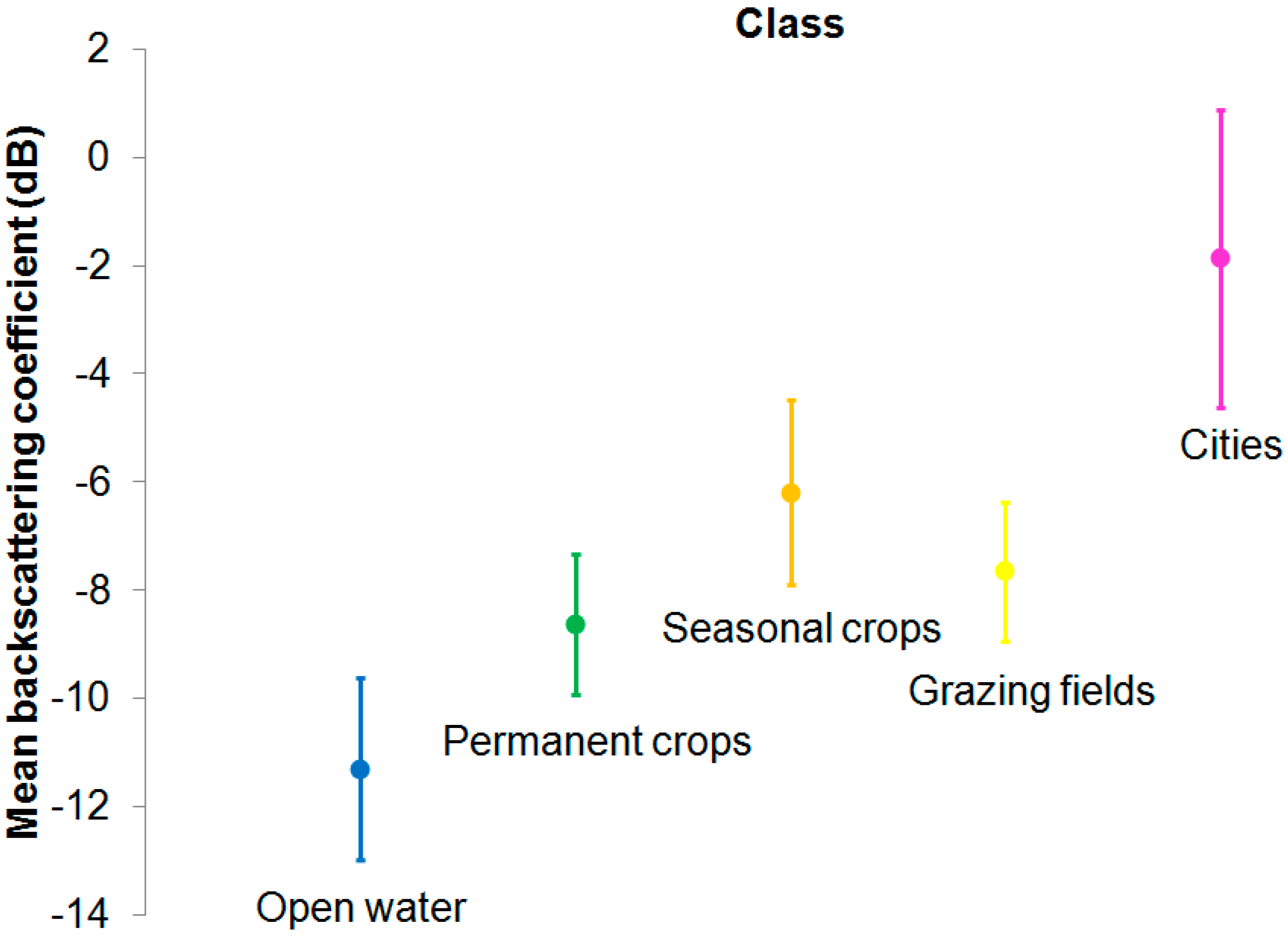 Average backscattering coefficient (dB) and associated standard deviation (dB) for each class resulting from a k-nearest neighbors supervised classification performed during the dry season (July–September) between 2005 and 2008: open water (blue), permanent crops (green), seasonal crops (orange), grazing fields (yellow), cities (pink).