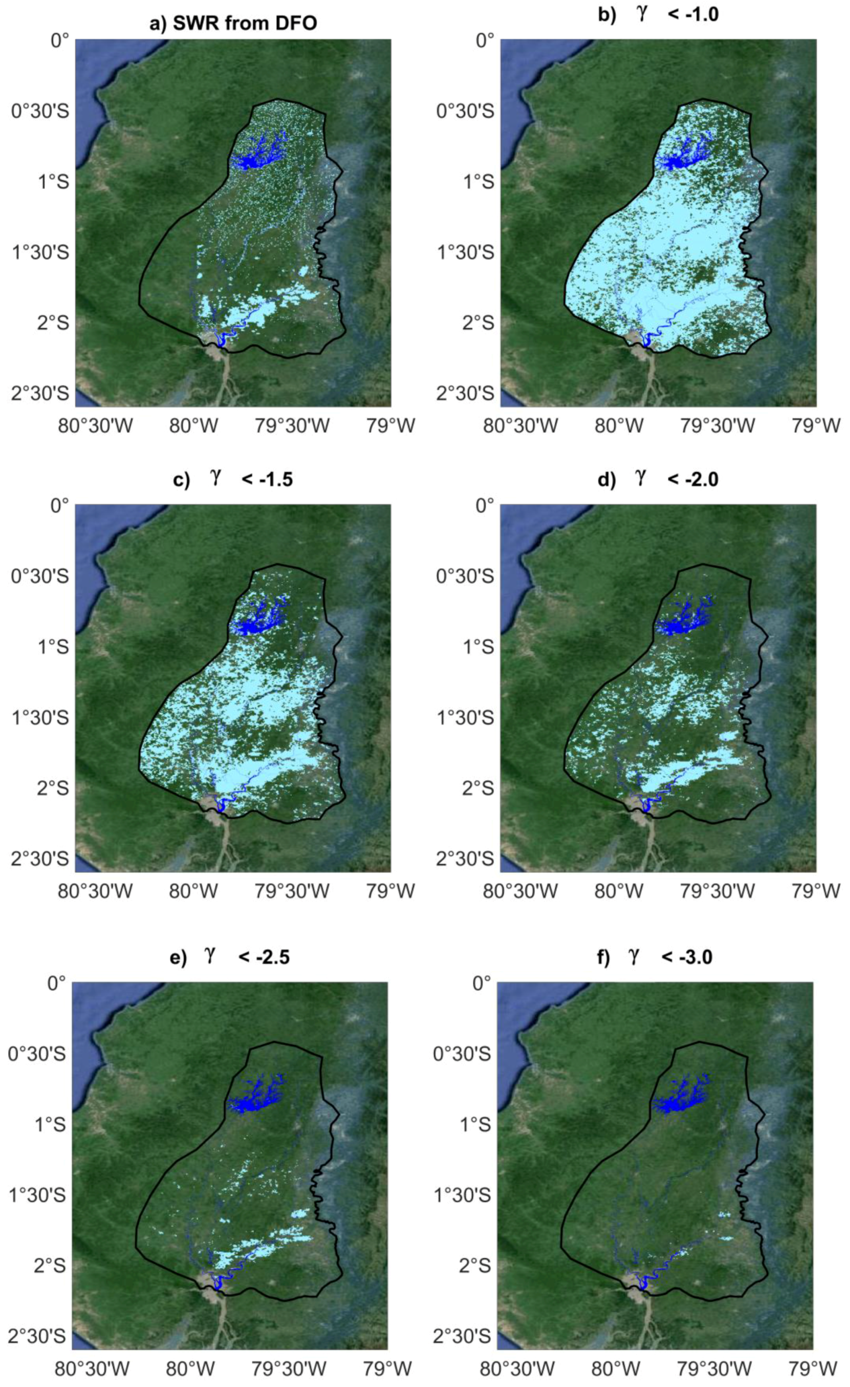Inundation in the Guayas watershed using the SWR from DFO (a). Normalized anomalies of backscattering coefficients (γ) lower than a given threshold appear in light blue. The threshold values equal −1.0 (b); −1.5 (c); −2.0 (d); −2.5 (e); and −3.0 (f) for 2008. Background image is from Google Maps. Permanent water bodies appear in blue.