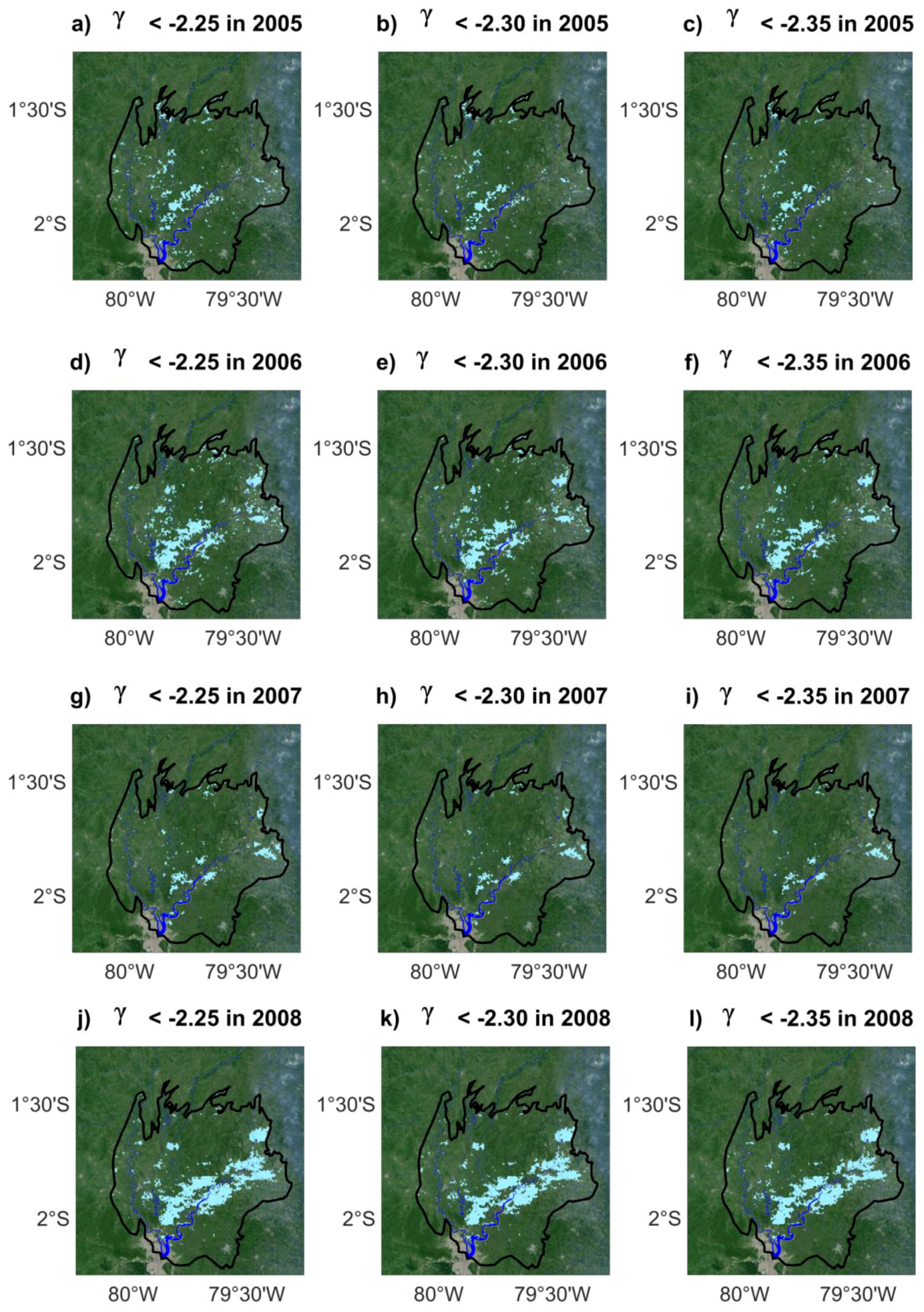 Maps of annual normalized anomalies of backscattering coefficients lower than a given threshold (light blue) in the Guayas floodplain (black line). The threshold values γ equals to −2.25 in 2005 (a); 2006 (d); 2007 (g); and 2008 (j); −2.30 in 2005 (b); 2006 (e); 2007 (h); and 2008 (k); −2.35 in 2005 (c); 2006 (f); 2007 (i); and 2008 (l). Background image is from Google Maps. Permanent water bodies appear in blue.