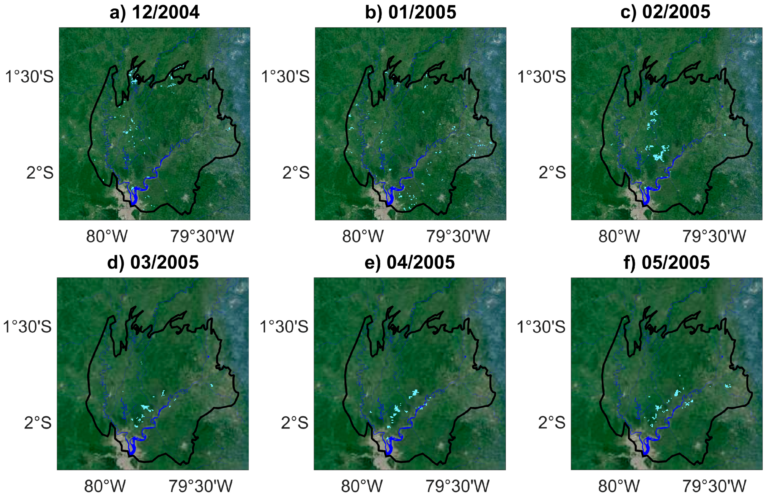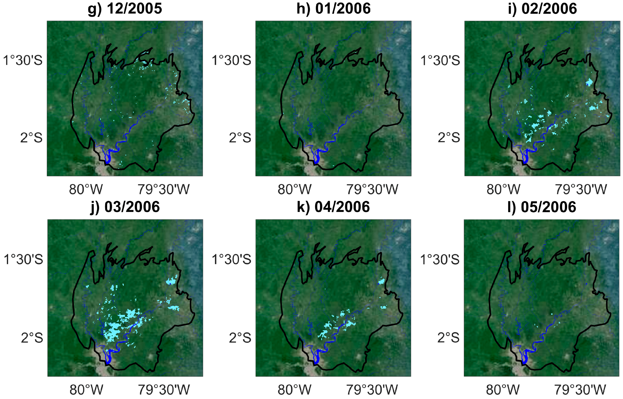 Monthly maps of inundation for normalized anomalies of backscattering coefficients lower than −2.30 (light blue) in the Guayas floodplain (black line) during the wet seasons of 2005 and 2006 (a–f) from December 2004 to May 2005; and (g–l) from December 2005 to May 2006. Background image is from Google Maps. Permanent water bodies appear in blue.
