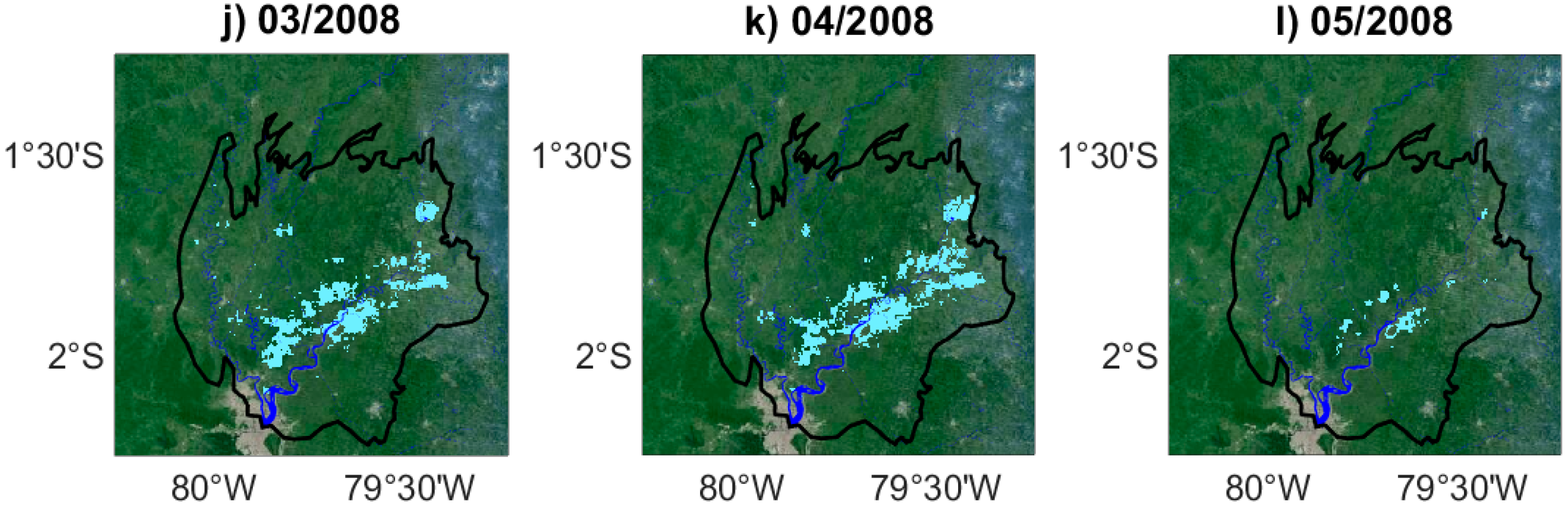 - Frappart, F.; Bourrel, L.; Riofrio Salazar, X.; Baup, F.; Darrozes, J.; Pombosa, R. Spatiotemporal dynamics of the floods in the Guayas watershed (Ecuadorian Pacific Coast) using ASAR images. In Proceedings of the 2015 IEEE International Geoscience and Remote Sensing Symposium (IGARSS), Milan, Italy, 26–31 July 2015; pp. 2515–2518.