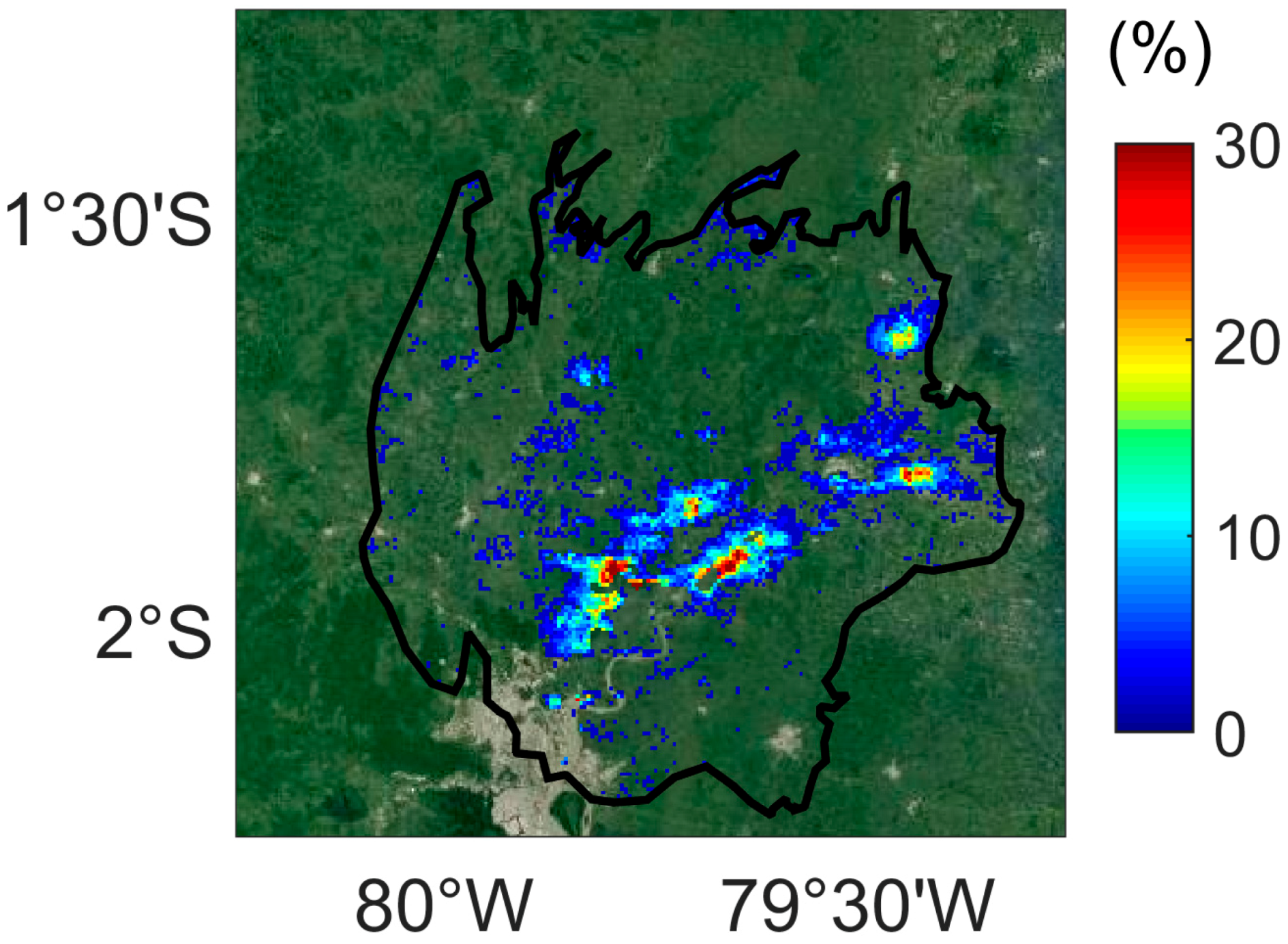 RFI maps of the Guayas floodplain were estimated using ENVISAT ASAR GM images acquired during the rainy seasons between December 2004 and June 2008 for the three threshold value used earlier. As they exhibit very similar patterns, only the one obtained using the −2.30 threshold value is presented in Figure 12. Four main areas of large flood occurrence (>25%): the junction between the Babahoyo and Quevedo Rivers, in the upstream north east of Guayaquil, the north and south banks of the Babahoyo River close to the city of Babahoyo, and the upstream eastern part of the floodplain. Secondary maxima (15%) can also be observed along the Daule River.