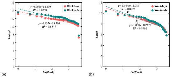 However, although Zipf’s law can be detected across many different countries or regions, it is hard to spot the statistical difference of city sizes from one country/region to another. In other words, the exponents being Zipf distribution only deviate slightly from 1, leading to little meaningful comparison from a statistical perspective. In order to formulate a more nuanced understanding between network metrics on weekdays and weekends, this study borrowed the idea of a rank cumulative size model [28], stated by the following equation:
