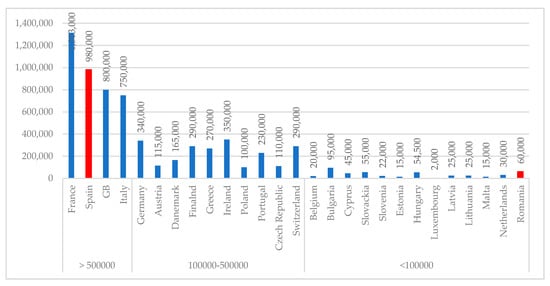 Regarding the development of hunting in general, and trophy hunting worldwide, particularly in Romania and in Spain, hunters believe that the future of this sector is moving towards commercial hunting, associated with purchasing power to ensure results. Even if the density of hunters is different across both countries, Romania and Spain being at opposite ends according to the data in Figure 1, Romania is in last place in Europe in 2017 with 60,000 hunters and Spain is in second place with 980,000 hunters, regardless of the nationality of the hunters, their values related to this sector are similar.