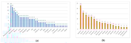 Regarding the place of origin of the Romanian and Spanish hunters, the distribution is presented in Figure 2a,b. For both countries, most hunters are from the country capital but cover an important geographical area of each country.