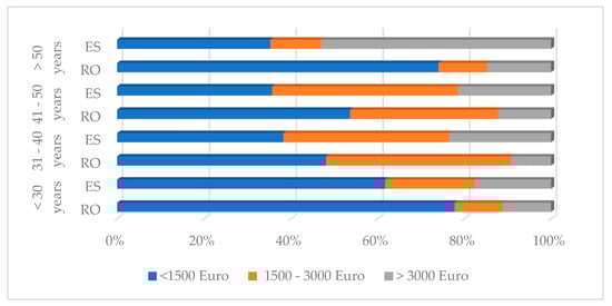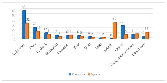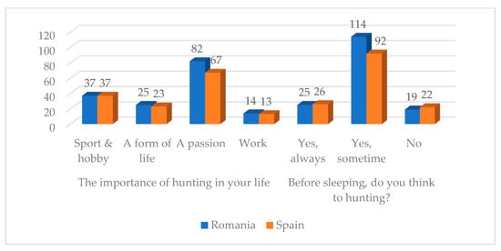 To test if there are statistically significant differences according to socio-demographic characteristics from Romania and Spain regarding the hunting data and hunters’ opinions, we applied the chi-square bivariate test. The results of the first crosstab table are presented graphically in Figure 8.