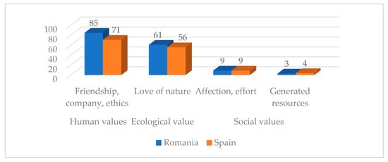The values of hunting are presented, comparatively, in Figure 5. Regarding what they would like to disappear from the world of hunting, the hierarchy of the answers is the same for Romanian and Spanish sampling: 61% for Romania, respectively, 64% for Spain opted for poor hunting and administrative management followed by hunters without ethics (25% for Romania and 19% for Spain), 8% for Romania and 11% for Spain opted for mischievous hunting, about 5% for improper weapons, only 1% for Romania and zero opted for trophy collectors.