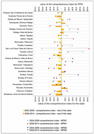 Of the townships admitted to the PPM in the years 2001–2004 (MPM1), only three cases were observed to experience an increase in the comprehensive index between the periods 2004–2009 and 2009–2014. At the same time, an increase in the index was noted for six states with MPM1 townships. In this group, there were four cases where the index value for the state would increase while the index value for the township would decline for the same time period. The opposite situation was observed in only one case where an increase in the index value for a township accompanied a corresponding decline in the index value for the state with that particular township (MPM Huasca de Ocampo, State of Hidalgo).