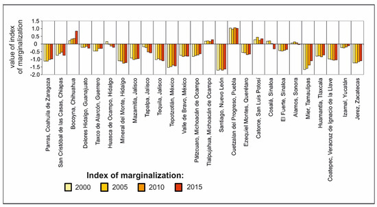 The analysis of index of marginalization values for the studied MPMs versus time (Figure 5) shows that the vast majority of studied townships achieved a result below the national average during all of the studied years. Only in four cases (MPM Bocoyna, MPM Tlapujahua, MPM Cuetzalan de Progreso, MPM Catorce) was the index value above the national average for the entire studied time period. In the case of MPM Cuetzalan del Progreso, this was the highest value for all the townships studied in all the study periods (1.04333, 0.9591, 1.0597, 1.027, respectively). In four subsequent cases, the initially positive index values declined below zero. The lowest index values were calculated for MPM Santiago (−1.7044, −1.6274, −1.7196, −1.627, respectively). These were the lowest index values for all the townships studied for every studied period.