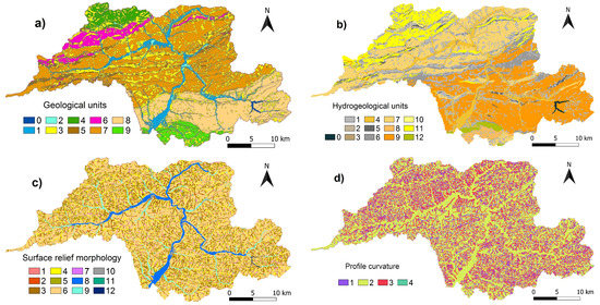 - Hydrogeological units (HGU) (Figure 3b)—units comprising lithology, lithostratigraphy of rocks, and hydrogeological properties of rock environment. Legend: 0 water; 1 lithofacial undivided loamy slope deposits, rocky soil and debris; 2 sandy-stony and boulder debris cones; 3 loams, sandy loams, sandy-loamy to boulderlike gravels in alluvial fans; 4 sands, sandy gravels and fine- to pebbly- gravels of terraces; 5 claystones, calcareous claystones and marlstone; 6 clayey flysch (flysch with claystones, siltstones and marlstones dominance); 7 normal flysch—claystones, siltstones and sandstones; 8 carbonate flysch (calcareous sandstones and marlstones); 9 sandy flysch (flysch with sandstone dominance); 10 conglomerate flysch (flysch with conglomerates dominance); 11 sandstones with claystones; 12 limestones, quartzy, sandy, marly and nodular limestones, radiolarites.