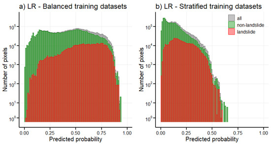 The usual practice in landslide susceptibility modelling is to train models on the balanced dataset, i.e., on a dataset containing the same number of landslide and non-landslide pixels. To achieve such training datasets during the cross-validation, landslide pixels were divided into 5 subsets and an equal number of non-landslide pixels was added to each subset. However, since landslides occur only rarely in nature, we also performed cross-validation with the stratified subsets, i.e., the ratio of landslide and non-landslide pixels in the subset was the same as the ratio in the whole dataset. The validation dataset for both types of training datasets was always stratified to simulate the frequency of landslide occurrence in nature.