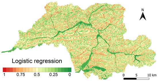 Logistic regression [72] is one of the most popular and widely used multivariate statistical methods for landslide susceptibility modelling [66,73]. It is a linear model and attempts to model the probability, p, of the event (in this case landslide) occurring based on the values of the input variables. The formula for the probability is defined as