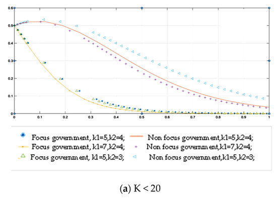 In order to investigate the influence of explicit and tacit knowledge level of the focus government and non-focus government on knowledge transformation behavior and final peer state more intuitively, this paper used MATLAB to carry out numerical simulation. The initial parameter assignment is shown in Table 3, and the initial behavior probability was set as (0.5,0.5). In this regard, the initial data were modelled and selected from government reports on the Yangtze River Economic Zone, and the corresponding indicators that could be drawn upon were transformed to the same order of magnitude. For example, K1 is the average number of green governance policies made public by the three focus governments of Jiangsu, Zhejiang, and Shanghai over the years, while K2 is the average number of green governance policies of non-focus governments such as Anhui. Other indicators were similarly compared to ensure the validity of the simulation.