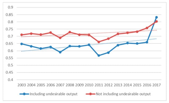 As can be seen from Figure 2, the urban land use- efficiency has been in a state of fluctuation from 2003 to 2011. From 2011 to 2017, urban land use- efficiency increased rapidly and showed a trend of continuous growth. Among them, the urban land use- efficiency without considering the undesired outputs and the urban land use- efficiency considering the expected outputs have extremely similar development trajectories, and the urban land-use efficiency considering the undesired outputs is generally lower than the urban land use efficiency without considering the undesired outputs.