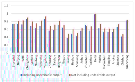 As shown in Figure 3, most cities are still at a low level from the perspective of each city, in which Hefei, Yangzhou, Changzhou, and Xuancheng have the best performance in urban land-use efficiency. Even without considering the non-expected output, these four cities still have the best performance. Moreover, the urban land use- efficiency without considering the undesirable outputs is always higher than the urban land use- efficiency without considering the undesirable outputs, which is consistent with the above results. In addition, undesired outputs also have an impact on the city ranking of urban land-use efficiency, which indicates that undesired outputs will affect the accuracy of the evaluation results of urban land-use efficiency.