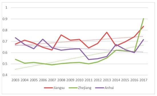 Figure 4 shows the average value of urban land use- efficiency in different regions. It can be seen that the level of urban land use- efficiency in Jiangsu Province is higher, followed by Anhui Province and Zhejiang Province. From the perspective of time trend, the urban land use-efficiency of Jiangsu Province shows a zigzag rising trend, and the growth rate is low. The urban land use-efficiency of Anhui Province showed a downward trend from 2003 to 2011, and began to rise again from 2011 to 2017, but it still decreased overall. The urban land use- efficiency of Zhejiang Province had a low starting point and remained stable during 2003–2011, but increased rapidly during 2011–2017, with the latter ranking the top and surpassing the other two provinces in 2017. It also shows that the growth of urban land use- efficiency in the Yangtze River Delta urban agglomeration mainly comes from the growth of urban land use- efficiency in Zhejiang Province.