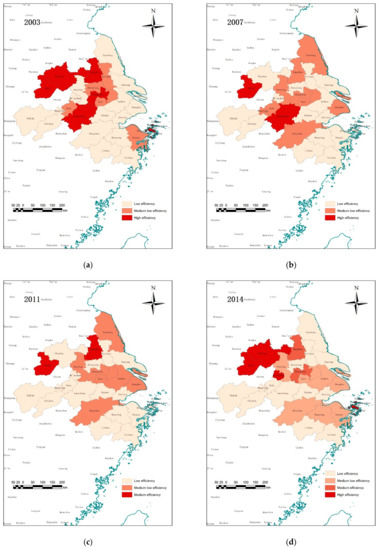 In the early stage, the efficient cities were mainly located in the inland areas, concentrated in the vicinity of Hefei, Yangzhou, Xuancheng, and Zhoushan, while the Coastal cities are generally inefficient. As time goes by, there is a trend of spatial dispersion, and the overall gap is decreasing. The cities with high efficiency are mainly concentrated in the inland areas, the middle and low-efficiency cities in Zhejiang Province are gradually increasing, while the efficiency of coastal cities has been improved. Subsequently, the number of high-efficiency gradually decreased and they were mainly concentrated in Jiangsu province, while the coastal cities were inefficiency. Then the high-efficiency cities are concentrated in inland areas, and mainly in Anhui province, while the efficiency of coastal cities is still at a low level. Finally, high-efficiency cities did not form a state of spatial agglomeration, but a spatial uniform state. The efficiency growth of Shanghai, Ningbo, and other coastal cities are very significant. In general, the efficiency of coastal cities is increasing, and the high-efficiency cities are no longer concentrated in the inland areas, and the spatial concentration state is transformed into a spatial dispersion state.
