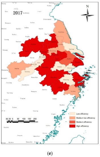 The Spatial Diagram of The Urban Land Use Efficiency. (a) The urban land use efficiency in 2003. (b) The urban land use efficiency in 2007. (c) The urban land use efficiency in 2011. (d) The urban land use efficiency in 2014. (e) The urban land use efficiency in 2017.